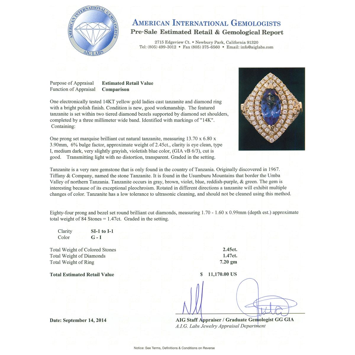 One electronically tested 14KT yellow gold ladies cast tanzanite and diamond ring with a bright polish finish. The featured tanzanite is set within two tiered diamond bezels supported by diamond set shoulders, completed by a three millimeter wide band. Identified with markings of "14K". Condition is new, good workmanship. Containing: One prong set marquise brilliant cut natural tanzanite, measuring 13.70 x 6.80 x 3.90mm, 6% bulge factor, approximate weight of 2.45ct., clarity is eye clean, type I, medium dark, very slightly grayish, violetish blue color, (GIA vB 6/3), cut is good. Transmitting light with no distortion, transparent. Graded in the setting. Tanzanite is a very rare gemstone that is only found in the country of Tanzania. Originally discovered in 1967. Tiffany & Company, named the stone Tanzanite. It is found in the Usumburu Mountains that border the Umba Valley of northern Tanzania. Tanzanite occurs in gray, brown, violet, blue, reddish-purple, & green. The gem is interesting because of its exceptional pleochroism. Rotated in different directions a tanzanite will exhibit multiple changes of color. Tanzanite has a low tolerance to ultrasonic cleaning, and should not be cleaned using this method. Eighty-Four prong and bezel set round brilliant cut diamonds, measuring 1.70 - 1.60 x 0.99mm (depth est.) approximate total weight of 84 Stones = 1.47ct. Graded in the setting. Clarity: SI-1 to I-1. Color: G - I. Total Weight of Colored Stones 2.45ct. Total Weight of Diamonds 1.47ct. Total Weight of Ring 7.20 grams. AIG Appraised at $11,170.00.