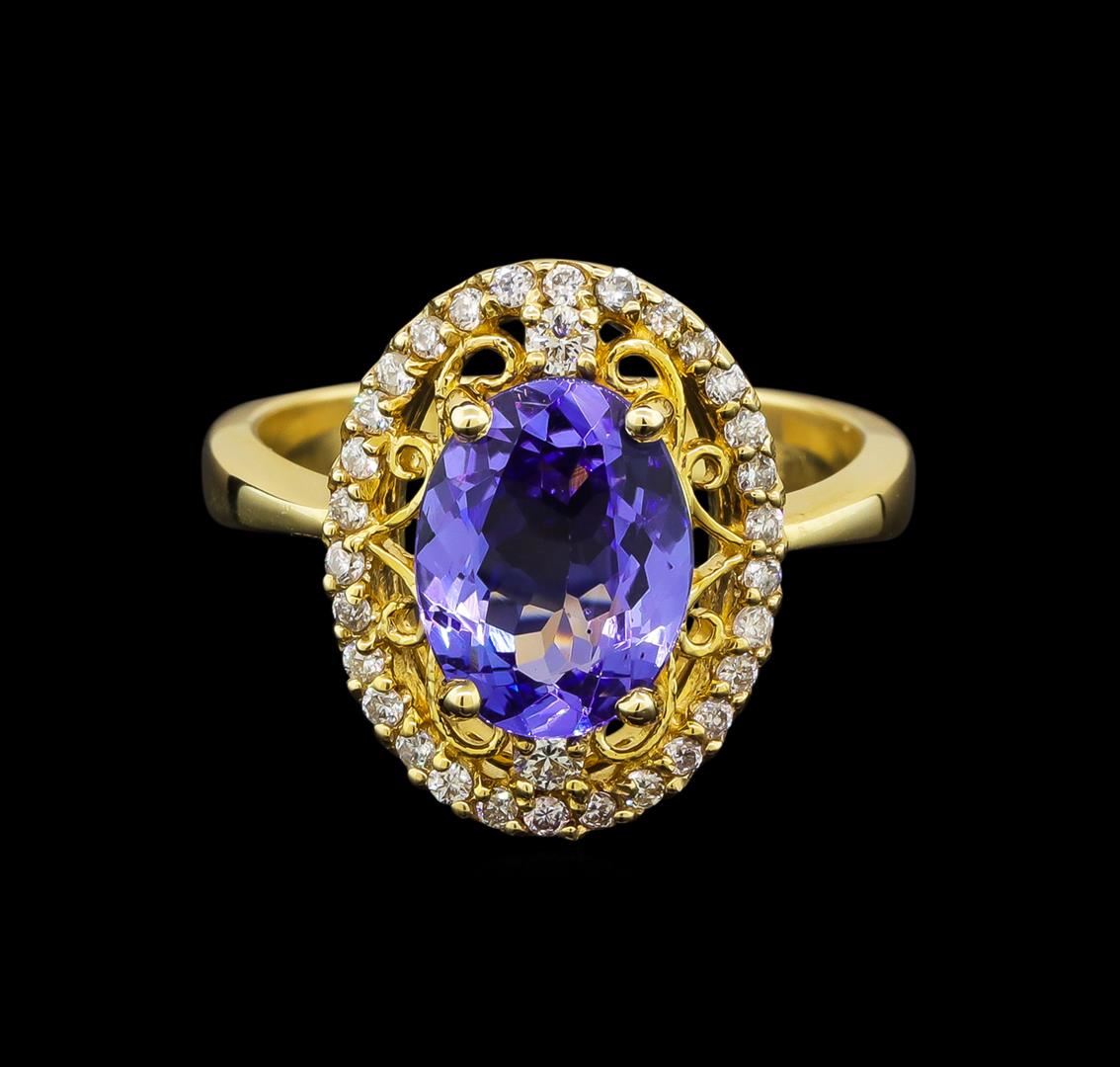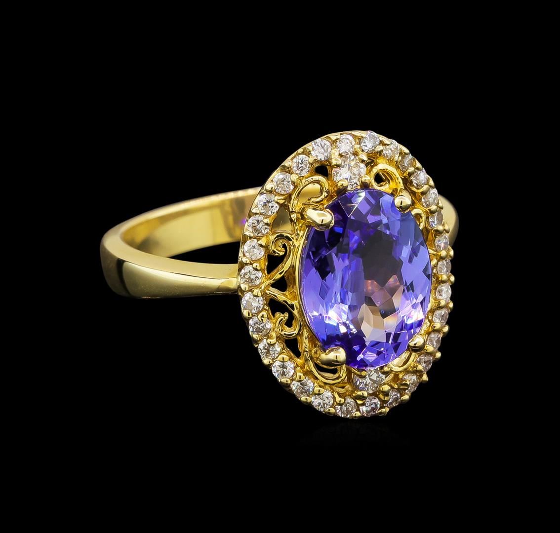 One electronically tested 14KT yellow gold ladies cast tanzanite and diamond ring with a bright polish finish. Identified with markings of "K14". Condition is new. Containing: One prong set oval modified brilliant cut natural tanzanite, measuring 10.90 x 7.80 x 4.10mm, approximate weight of 2.45ct., clarity is eye clean, type I, medium light, very slightly grayish, violet color, (GIA V 4/3), cut is good. Thirty-Two prong set round brilliant cut diamonds, measuring 1.90 - 1.20 x 0.93mm (depth est.) approximate total weight of 32 Stones = 0.22ct. Clarity: SI-1 to I-1. Color: H - I, Cut is Good. Colored gemstones are presumed to have been subjected to commonly used enhancement processes. All diamonds and colored gemstones are graded in the mounting, unless otherwise stated. Total Weight of Colored Stones 2.45ct. Total Weight of Diamonds 0.22ct. Total Weight of Ring 4.70 grams. GGL Appraised at $2,775.00.