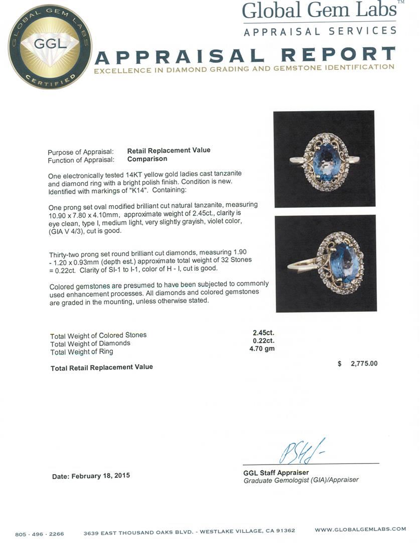 One electronically tested 14KT yellow gold ladies cast tanzanite and diamond ring with a bright polish finish. Identified with markings of "K14". Condition is new. Containing: One prong set oval modified brilliant cut natural tanzanite, measuring 10.90 x 7.80 x 4.10mm, approximate weight of 2.45ct., clarity is eye clean, type I, medium light, very slightly grayish, violet color, (GIA V 4/3), cut is good. Thirty-Two prong set round brilliant cut diamonds, measuring 1.90 - 1.20 x 0.93mm (depth est.) approximate total weight of 32 Stones = 0.22ct. Clarity: SI-1 to I-1. Color: H - I, Cut is Good. Colored gemstones are presumed to have been subjected to commonly used enhancement processes. All diamonds and colored gemstones are graded in the mounting, unless otherwise stated. Total Weight of Colored Stones 2.45ct. Total Weight of Diamonds 0.22ct. Total Weight of Ring 4.70 grams. GGL Appraised at $2,775.00.