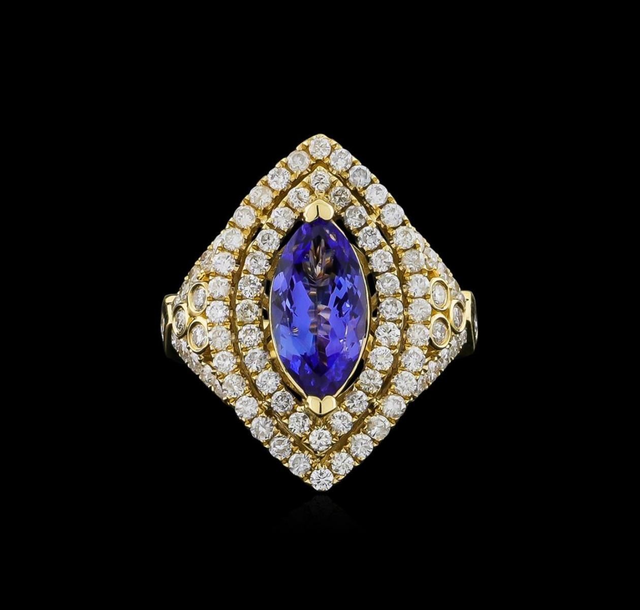 One electronically tested 14KT yellow gold ladies cast tanzanite and diamond ring with a bright polish finish. The featured tanzanite is set within two tiered diamond bezels supported by diamond set shoulders, completed by a three millimeter wide band. Identified with markings of "14K". Condition is new, good workmanship. Containing: One prong set marquise brilliant cut natural tanzanite, measuring 13.70 x 6.80 x 3.90mm, 6% bulge factor, approximate weight of 2.45ct., clarity is eye clean, type I, medium dark, very slightly grayish, violetish blue color, (GIA vB 6/3), cut is good. Transmitting light with no distortion, transparent. Graded in the setting. Tanzanite is a very rare gemstone that is only found in the country of Tanzania. Originally discovered in 1967. Tiffany & Company, named the stone Tanzanite. It is found in the Usumburu Mountains that border the Umba Valley of northern Tanzania. Tanzanite occurs in gray, brown, violet, blue, reddish-purple, & green. The gem is interesting because of its exceptional pleochroism. Rotated in different directions a tanzanite will exhibit multiple changes of color. Tanzanite has a low tolerance to ultrasonic cleaning, and should not be cleaned using this method. Eighty-Four prong and bezel set round brilliant cut diamonds, measuring 1.70 - 1.60 x 0.99mm (depth est.) approximate total weight of 84 Stones = 1.47ct. Graded in the setting. Clarity: SI-1 to I-1. Color: G - I. Total Weight of Colored Stones 2.45ct. Total Weight of Diamonds 1.47ct. Total Weight of Ring 7.20 grams. AIG Appraised.
