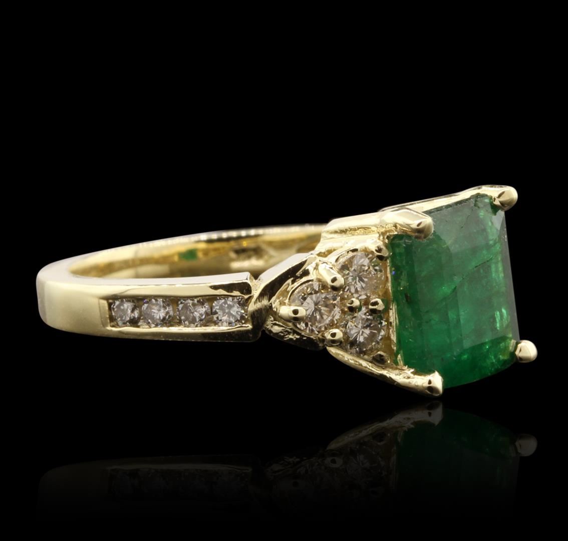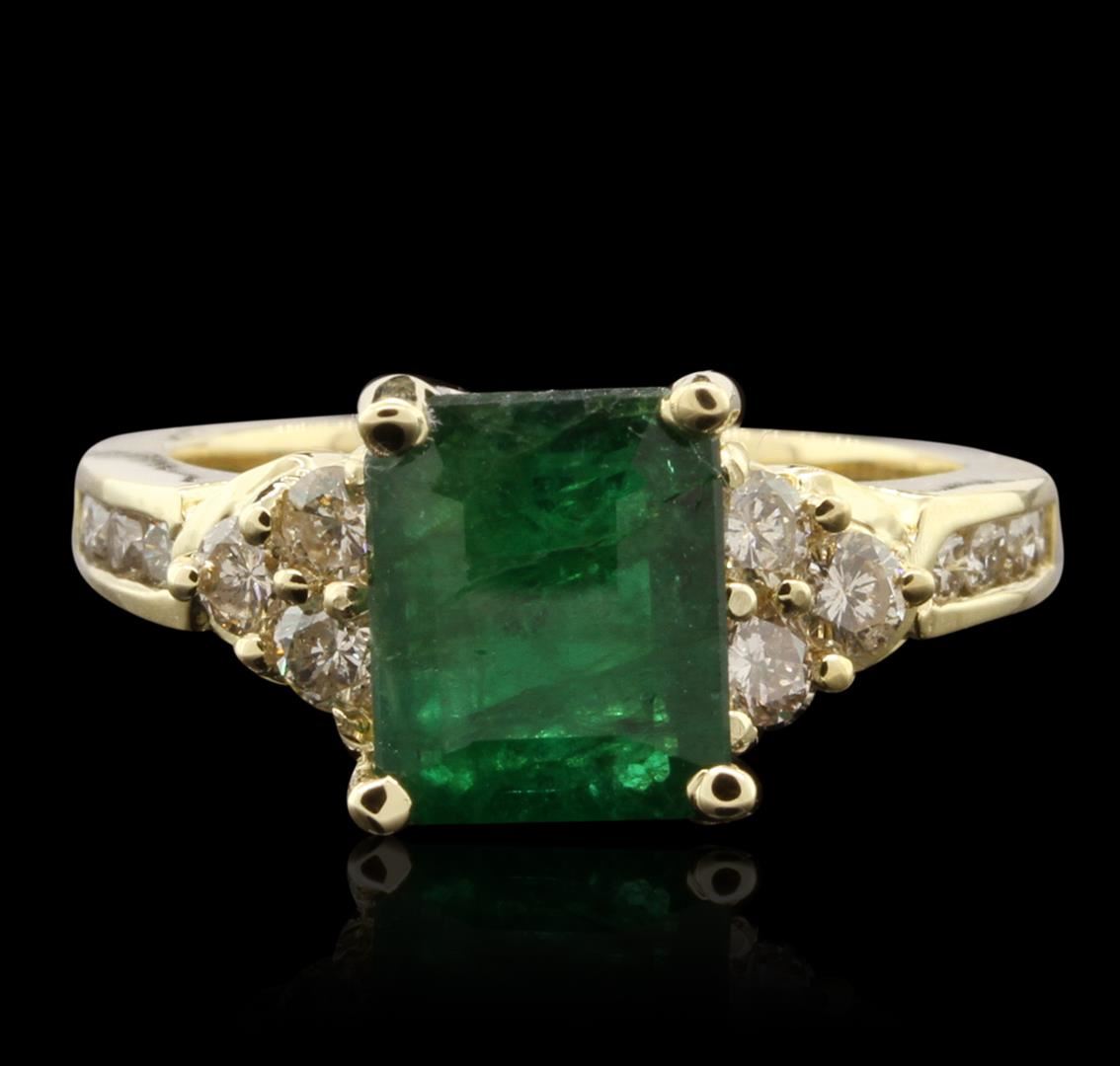 One electronically tested 14KT yellow gold ladies cast emerald and diamond ring with a bright polish finish. The featured emerald is supported by elaborate diamond set shoulders, completed by a two and one-half millimeter wide band. Identified with markings of "14K". Condition is new, good workmanship. Containing: One prong set rectangular step cut natural emerald, measuring 8.80 x 7.15 x 4.42mm, 8%. bulge factor, approximate weight of 2.45ct., clarity is heavily included, type III, medium dark, very slightly grayish, very slightly bluish green color, (GIA vslbG 6/3), cut is good. Transmitting light with a minimum of distortion, transparent. Naturally occurring internal & external characteristics are present. Indications of oil & opticon residue. Graded in the setting. Six prong set round brilliant cut diamonds, measuring 2.60 - 2.50 x 1.53mm (depth est.) approximate. Total Weight of 6 Stones = 0.46ct. Graded in the setting. Clarity: SI-1 to I-1 . Color: H - J Eight channel set round brilliant cut diamonds, measuring 1.80 - 1.80 x 1.08mm (depth est.) approximate. Total Weight of 8 Stones = 0.27ct. Graded in the setting. Clarity: SI-1 to I-1 . Color: G - I. Total Weight of Colored Stones 2.45ct. Total Weight of Diamonds 0.73ct. AIG Appraised at $5,810.00.