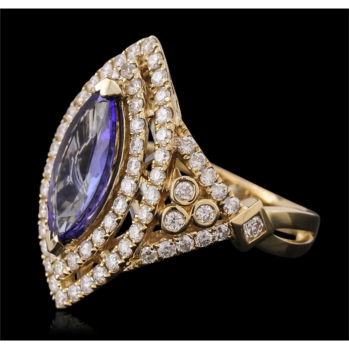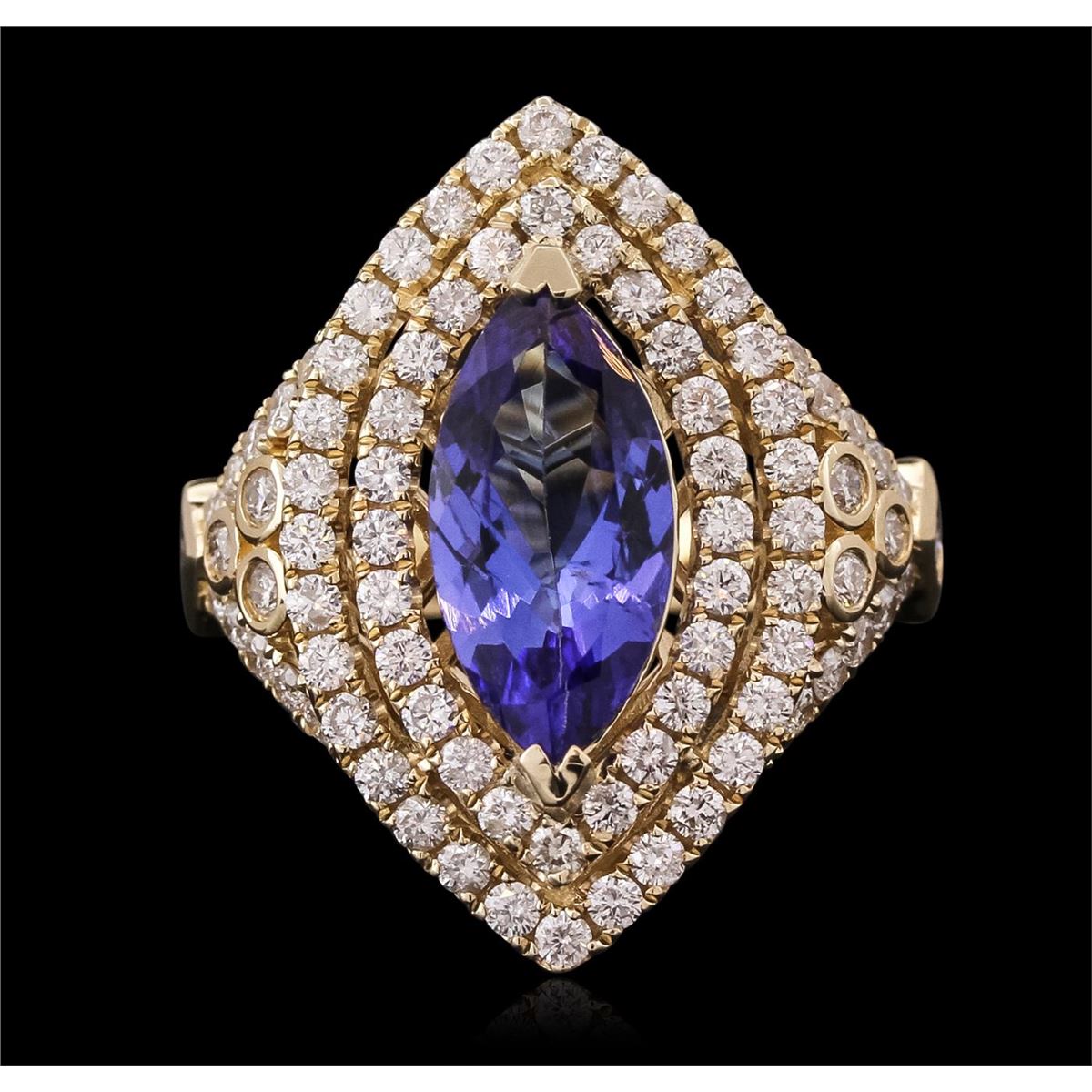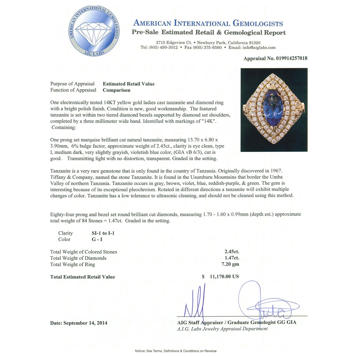 One electronically tested 14KT yellow gold ladies cast tanzanite and diamond ring with a bright polish finish. The featured tanzanite is set within two tiered diamond bezels supported by diamond set shoulders, completed by a three millimeter wide band. Identified with markings of "14K". Condition is new, good workmanship. Containing: One prong set marquise brilliant cut natural tanzanite, measuring 13.70 x 6.80 x 3.90mm, 6% bulge factor, approximate weight of 2.45ct., clarity is eye clean, type I, medium dark, very slightly grayish, violetish blue color, (GIA vB 6/3), cut is good. Transmitting light with no distortion, transparent. Graded in the setting. Tanzanite is a very rare gemstone that is only found in the country of Tanzania. Originally discovered in 1967. Tiffany & Company, named the stone Tanzanite. It is found in the Usumburu Mountains that border the Umba Valley of northern Tanzania. Tanzanite occurs in gray, brown, violet, blue, reddish-purple, & green. The gem is interesting because of its exceptional pleochroism. Rotated in different directions a tanzanite will exhibit multiple changes of color. Tanzanite has a low tolerance to ultrasonic cleaning, and should not be cleaned using this method. Eighty-Four prong and bezel set round brilliant cut diamonds, measuring 1.70 - 1.60 x 0.99mm (depth est.) approximate total weight of 84 Stones = 1.47ct. Graded in the setting. Clarity: SI-1 to I-1. Color: G - I. Total Weight of Colored Stones 2.45ct. Total Weight of Diamonds 1.47ct. Total Weight of Ring 7.20 grams. AIG Appraised at $11,170.00.