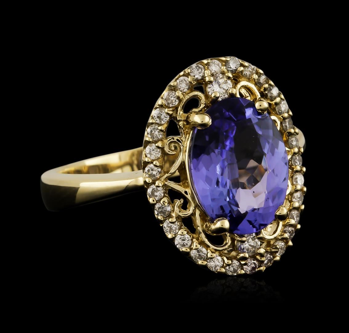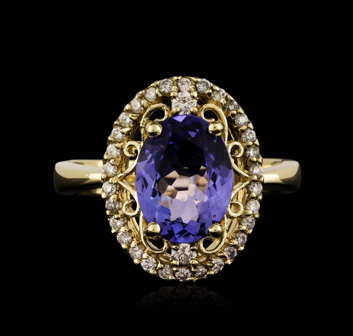 One electronically tested 14KT yellow gold ladies cast tanzanite and diamond ring with a bright polish finish. Identified with markings of "K14". Condition is new. Containing: One prong set oval modified brilliant cut natural tanzanite, measuring 10.90 x 7.80 x 4.10mm, approximate weight of 2.45ct., clarity is eye clean, type I, medium light, very slightly grayish, violet color, (GIA V 4/3), cut is good. Thirty-Two prong set round brilliant cut diamonds, measuring 1.90 - 1.20 x 0.93mm (depth est.) approximate total weight of 32 Stones = 0.22ct. Clarity: SI-1 to I-1. Color: H - I, Cut is Good. Colored gemstones are presumed to have been subjected to commonly used enhancement processes. All diamonds and colored gemstones are graded in the mounting, unless otherwise stated. Total Weight of Colored Stones 2.45ct. Total Weight of Diamonds 0.22ct. Total Weight of Ring 4.70 grams. GGL Appraised at $2,775.00.