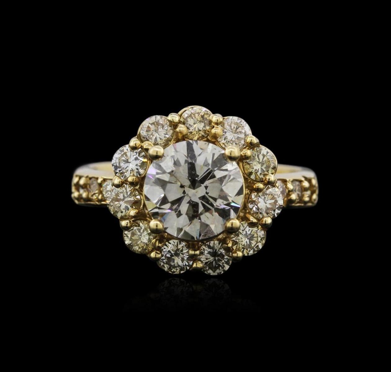 One electronically tested 14KT yellow gold ladies cast diamond engagement ring with a bright polish finish. Identified with markings of "585". Condition is new. Containing: One prong set round brilliant cut diamond, measuring 7.80 - 7.80 x 5.00mm (depth est.) approximate weight of 1.86ct. Clarity: VS-2. Color: L, Cut is Good. Seventeen prong set round brilliant cut diamonds, measuring 2.50 - 1.50 x 1.20mm (depth est.) approximate total weight of 17 Stones = 0.60ct. Clarity: SI-2 to I-1. Color: L - M, Cut is Good. Diamonds are graded in the mounting, unless otherwise stated. Total Weight of Diamonds 2.46ct. Total Weight of Engagement Ring 6.00 grams. GGL Appraised.
