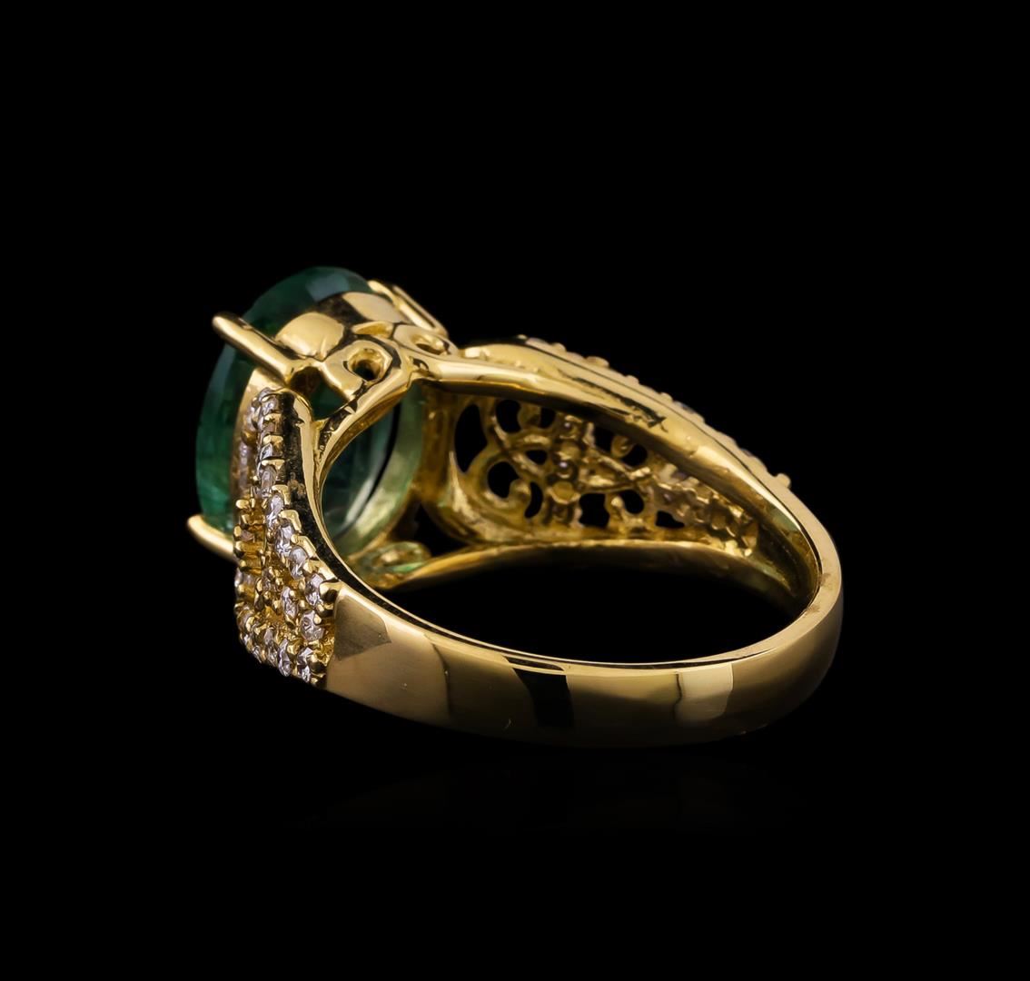 One electronically tested 14KT yellow gold ladies cast emerald and diamond ring with a bright polish finish. Identified with markings of "K14". Condition is new. Containing: One prong set oval modified brilliant cut natural emerald, measuring 11.43 x 8.70 x 4.35mm, approximate weight of 2.47ct., clarity is slightly included, type III, light, very slightly grayish, green color, (GIA G 3/3), cut is good. Fifty-Eight prong set round brilliant cut diamonds, measuring 1.30 - 1.30 x 0.78mm (depth est.) approximate total weight of 58 Stones = 0.46ct. Clarity: SI-2 to I-1. Color: K, Cut is Good. Colored gemstones are presumed to have been subjected to commonly used enhancement processes. All diamonds and colored gemstones are graded in the mounting, unless otherwise stated. Total Weight of Colored Stones 2.47ct. Total Weight of Diamonds 0.46ct. Total Weight of Ring 5.50 grams. GGL Appraised at $4,475.00.