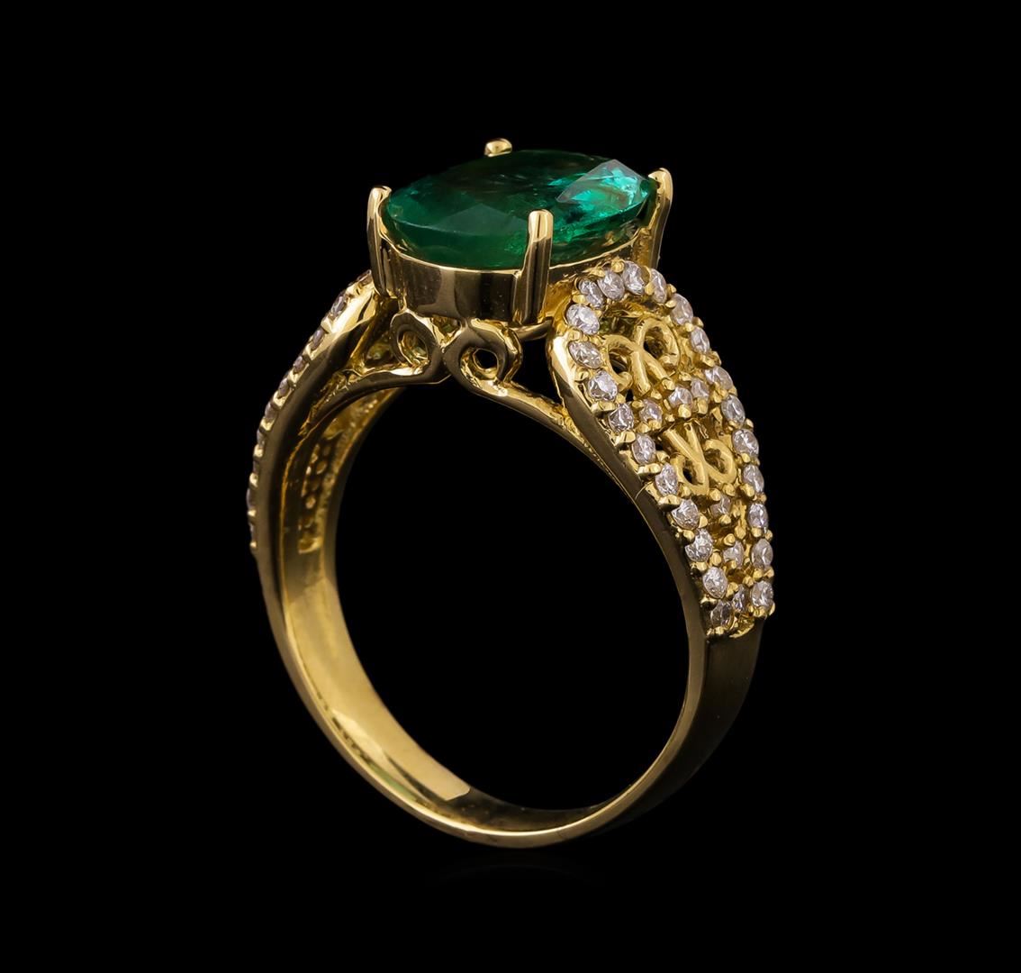 One electronically tested 14KT yellow gold ladies cast emerald and diamond ring with a bright polish finish. Identified with markings of "K14". Condition is new. Containing: One prong set oval modified brilliant cut natural emerald, measuring 11.43 x 8.70 x 4.35mm, approximate weight of 2.47ct., clarity is slightly included, type III, light, very slightly grayish, green color, (GIA G 3/3), cut is good. Fifty-Eight prong set round brilliant cut diamonds, measuring 1.30 - 1.30 x 0.78mm (depth est.) approximate total weight of 58 Stones = 0.46ct. Clarity: SI-2 to I-1. Color: K, Cut is Good. Colored gemstones are presumed to have been subjected to commonly used enhancement processes. All diamonds and colored gemstones are graded in the mounting, unless otherwise stated. Total Weight of Colored Stones 2.47ct. Total Weight of Diamonds 0.46ct. Total Weight of Ring 5.50 grams. GGL Appraised at $4,475.00.