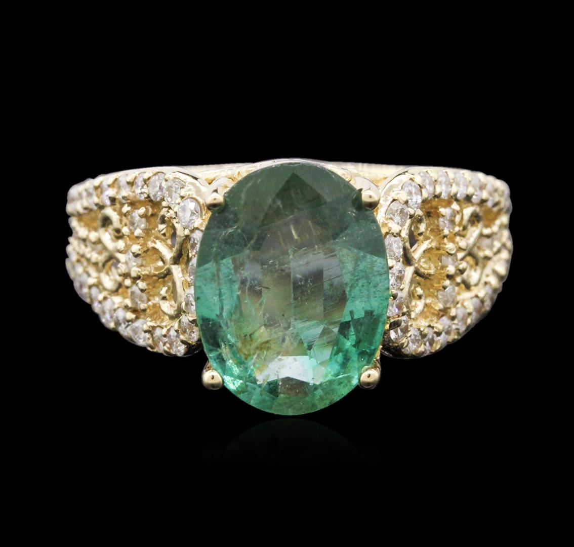 One electronically tested 14KT yellow gold ladies cast emerald and diamond ring with a bright polish finish. Identified with markings of "K14". Condition is new. Containing: One prong set oval modified brilliant cut natural emerald, measuring 11.43 x 8.70 x 4.35mm, approximate weight of 2.47ct., clarity is slightly included, type III, light, very slightly grayish, green color, (GIA G 3/3), cut is good. Fifty-Eight prong set round brilliant cut diamonds, measuring 1.30 - 1.30 x 0.78mm (depth est.) approximate total weight of 58 Stones = 0.46ct. Clarity: SI-2 to I-1. Color: K, Cut is Good. Colored gemstones are presumed to have been subjected to commonly used enhancement processes. All diamonds and colored gemstones are graded in the mounting, unless otherwise stated. Total Weight of Colored Stones 2.47ct. Total Weight of Diamonds 0.46ct. Total Weight of Ring 5.50 grams. GGL Appraised at $4,475.00.
