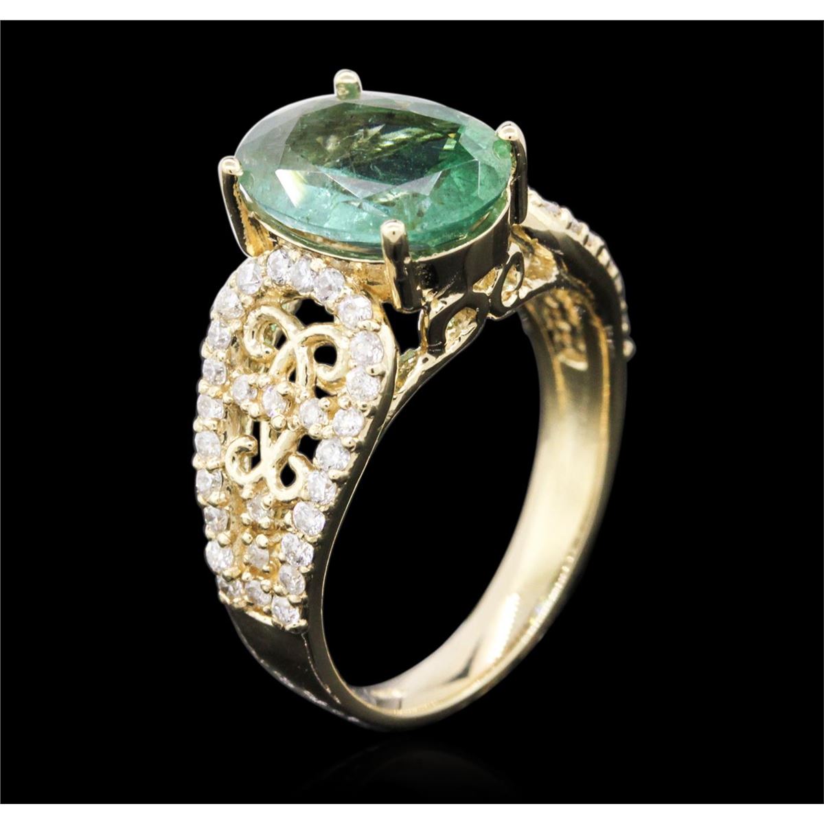 One electronically tested 14KT yellow gold ladies cast emerald and diamond ring with a bright polish finish. Identified with markings of "K14". Condition is new. Containing: One prong set oval modified brilliant cut natural emerald, measuring 11.43 x 8.70 x 4.35mm, approximate weight of 2.47ct., clarity is slightly included, type III, light, very slightly grayish, green color, (GIA G 3/3), cut is good. Fifty-Eight prong set round brilliant cut diamonds, measuring 1.30 - 1.30 x 0.78mm (depth est.) approximate total weight of 58 Stones = 0.46ct. Clarity: SI-2 to I-1. Color: K, Cut is Good. Colored gemstones are presumed to have been subjected to commonly used enhancement processes. All diamonds and colored gemstones are graded in the mounting, unless otherwise stated. Total Weight of Colored Stones 2.47ct. Total Weight of Diamonds 0.46ct. Total Weight of Ring 5.50 grams. GGL Appraised at $4,475.00.