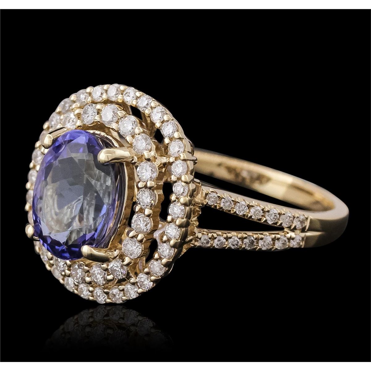 One electronically tested 14KT yellow gold ladies combination cast & assembled tanzanite and diamond ring with a split shank with a bright polish finish. Identified with markings of "14K". Condition is new. Containing: One prong set oval modified brilliant cut natural tanzanite, measuring 9.64 x 7.62 x 4.95mm, approximate weight of 2.47ct., clarity is eye clean, type I, medium, moderately strong, bluish violet color, (GIA bV 5/4), cut is good. Seventy-Six prong set round brilliant cut diamonds, measuring 1.30 - 1.10 x 0.72mm (depth est.) approximate total weight of 76 Stones = 0.48ct. Clarity: I-1 to I-2. Color: J - K, Cut is Good. Colored gemstones are presumed to have been subjected to commonly used enhancement processes. All diamonds and colored gemstones are graded in the mounting, unless otherwise stated total weight of Colored Stones 2.47ct. Total Weight of Diamonds 0.48ct. Total Weight of Ring 5.60 grams. GGL Appraised at $6,805.00.