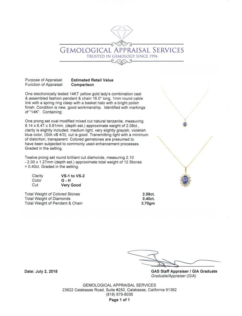 One electronically tested 14KT yellow gold lady's combination cast & assembled fashion pendant & chain 16.0' long, 1mm round cable link with a spring ring clasp with a basket halo with a bright polish finish. Identified with markings of '14K'. Condition is new, good workmanship. Containing: One prong set oval modified mixed cut natural tanzanite, measuring 8.14 x 6.47 x 5.61mm, (depth est.) approximate weight of 2.08ct., clarity is slightly included, medium light, very slightly grayish, violetish blue color, (GIA vB 4/3), cut is good. Transmitting light with a minimum of distortion, transparent. Colored gemstones are presumed to have been subjected to commonly used enhancement processes. Graded in the setting. Twelve prong set round brilliant cut diamonds, measuring 2.10 - 2.00 x 1.27mm (depth est.) approximate total weight of 12 Stones = 0.40ct. Graded in the setting. Color G - H Clarity VS-1 to VS-2 Cut Very Good. Total Weight of Colored Stones 2.08ct. Total Weight of Diamonds 0.40ct. Total Weight of Pendant & Chain 3.70gm. GAS Appraised.