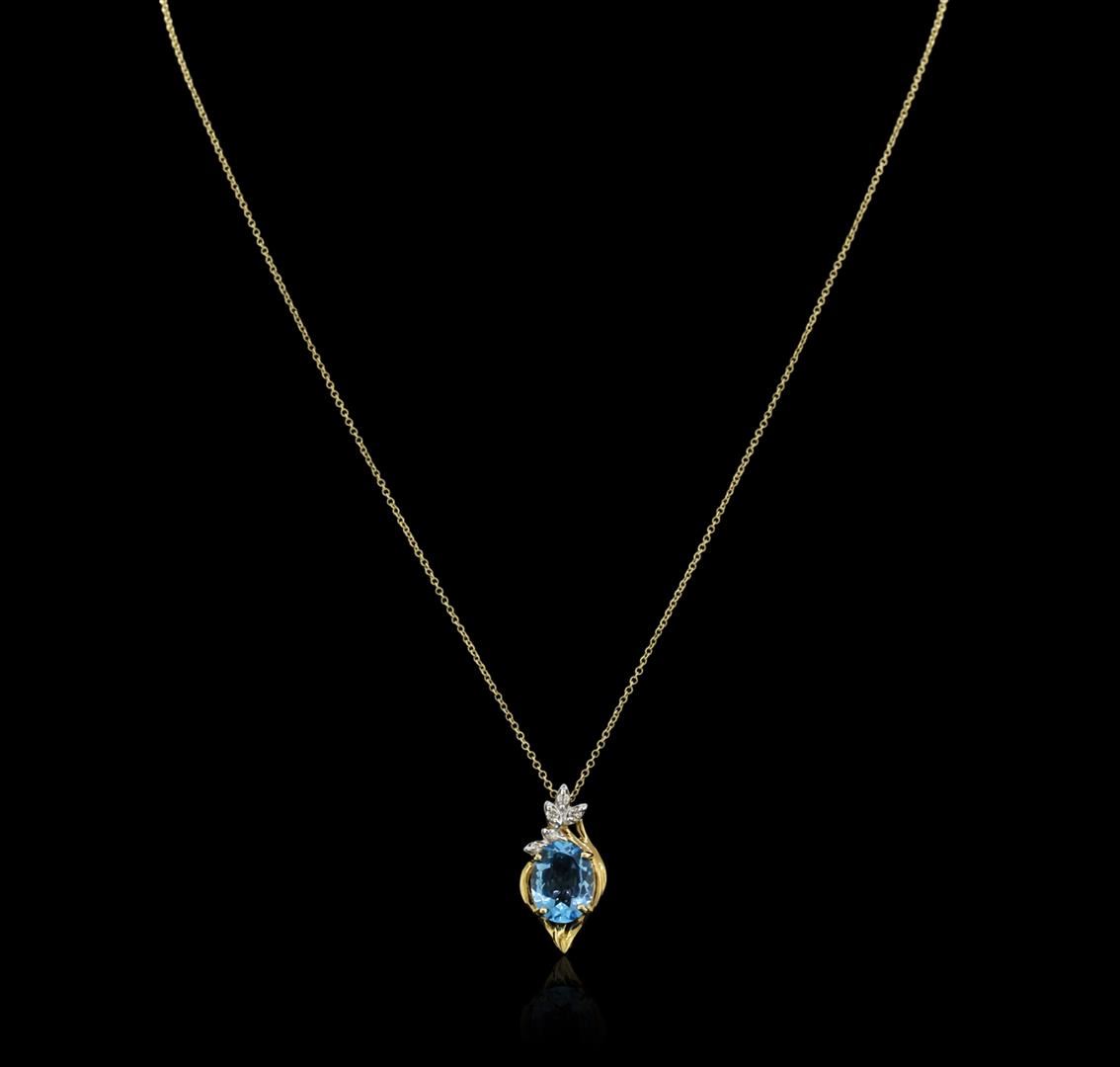 One pendant with chain featuring: 14KT yellow gold weighing 1.90 grams containing one blue topaz center stone with a total weight of 2.48ct and diamonds with a total weight of 0.10ct.