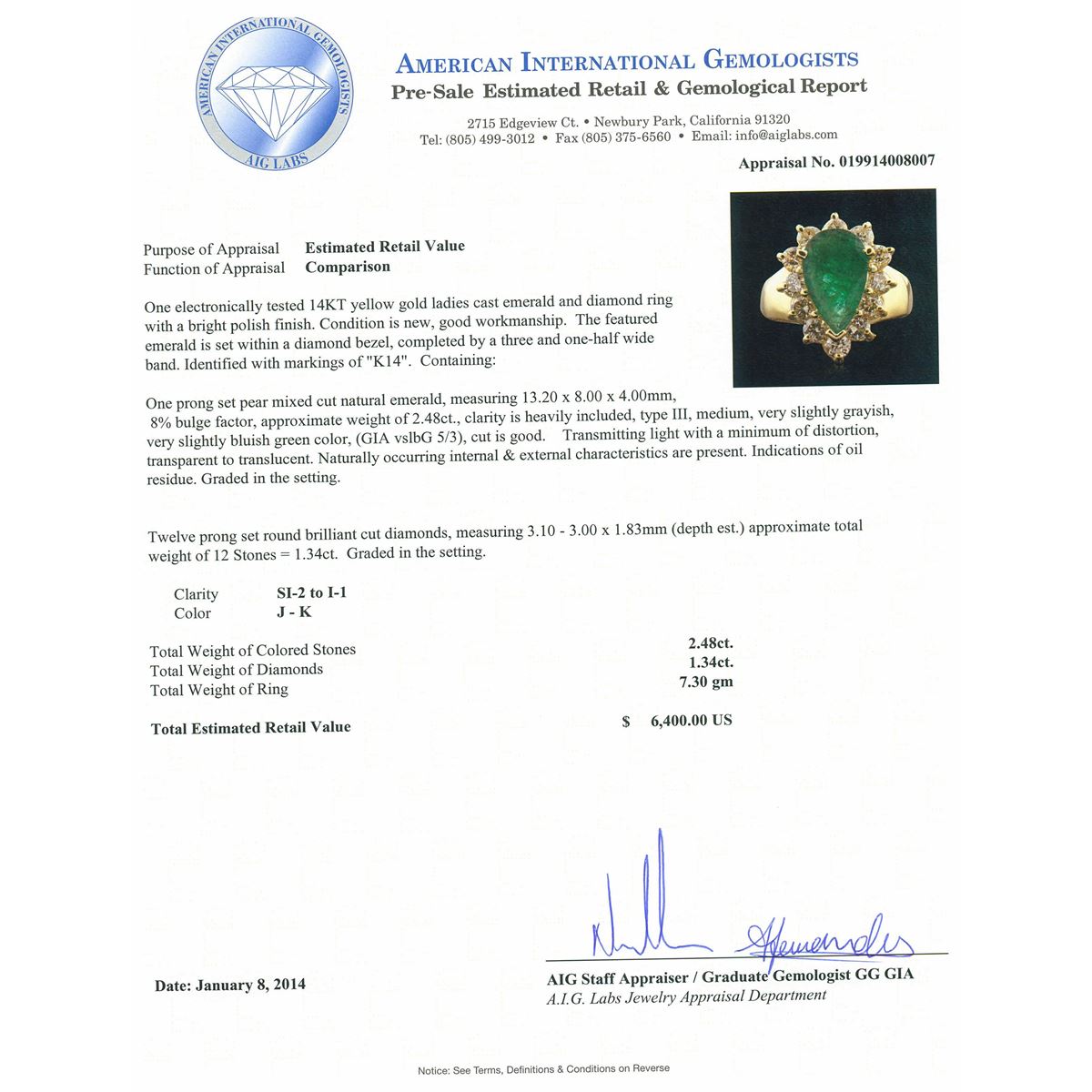 One electronically tested 14KT yellow gold ladies cast emerald and diamond ring with a bright polish finish. The featured emerald is set within a diamond bezel, completed by a three and one-half wide band. Identified with markings of "K14". Condition is new, good workmanship. Containing: One prong set pear mixed cut natural emerald, measuring 13.20 x 8.00 x 4.00mm, 8%. bulge factor, approximate weight of 2.48ct., clarity is heavily included, type III, medium, very slightly grayish, very slightly bluish green color, (GIA vslbG 5/3), cut is good. Transmitting light with a minimum of distortion, transparent to translucent. Naturally occurring internal & external characteristics are present. Indications of oil residue. Graded in the setting. Twelve prong set round brilliant cut diamonds, measuring 3.10 - 3.00 x 1.83mm (depth est.) approximate. Total Weight of 12 Stones = 1.34ct. Graded in the setting. Clarity: SI-2 to I-1 . Color: J - K. Total Weight of Colored Stones 2.48ct. Total Weight of Diamonds 1.34ct. AIG Appraised at $6,400.00.
