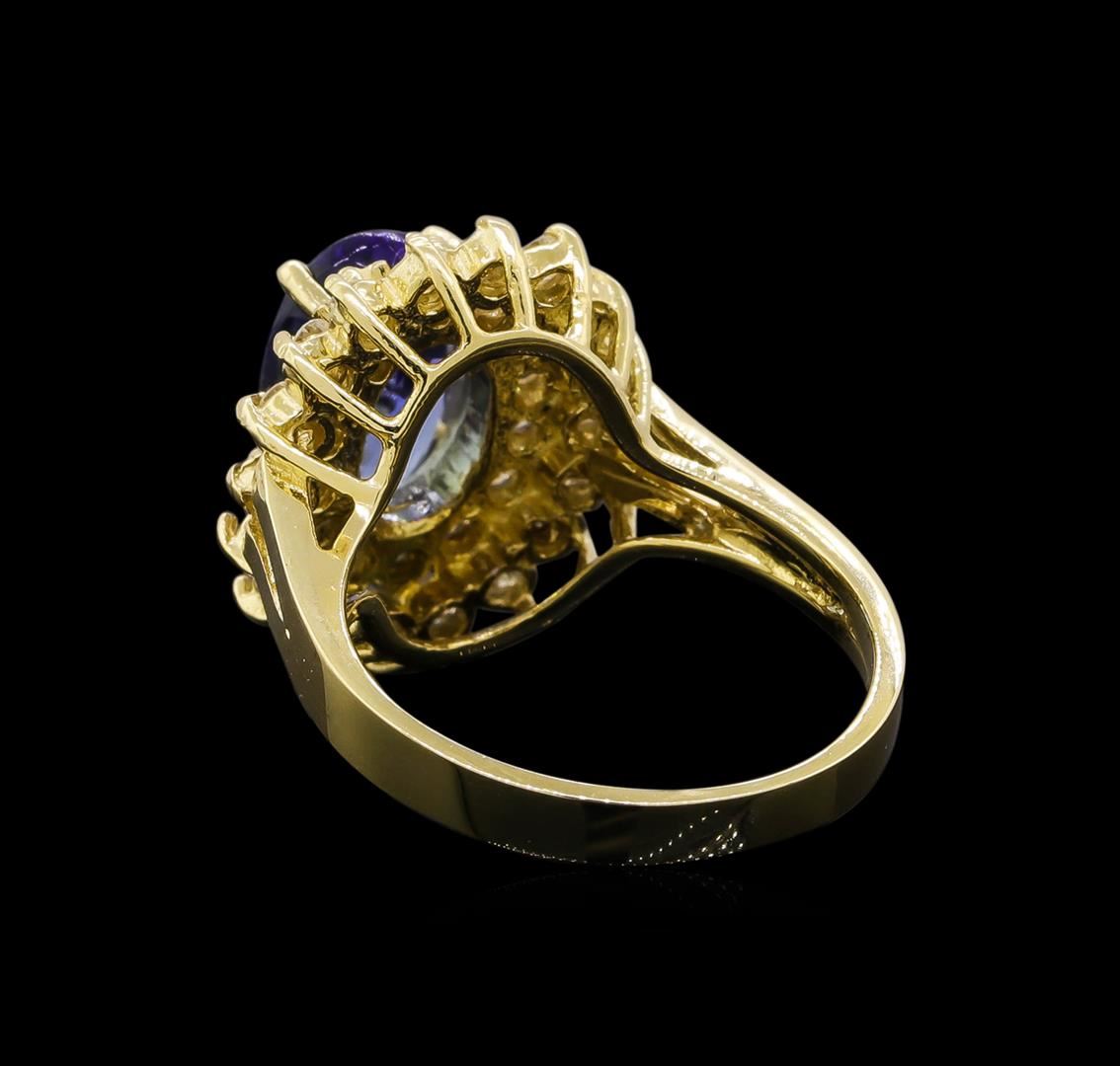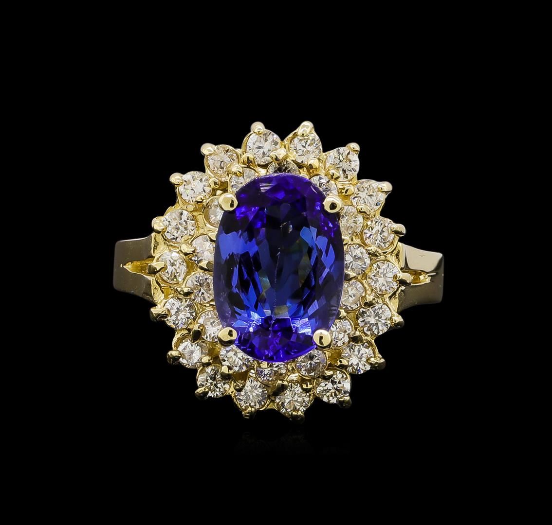 One electronically tested 14KT yellow gold ladies cast tanzanite and diamond ring with a bright polish finish. Identified with markings of "14KT". Condition is new. Containing: One prong set oval modified brilliant cut natural tanzanite, measuring 10.50 x 7.20 x 4.68mm, approximate weight of 2.49ct., clarity is eye clean, type I, medium, very slightly grayish, violet color, (GIA V 5/3), cut is very good. Thirty-Two prong set round brilliant cut diamonds, measuring 1.70 - 1.74 x 1.03mm (depth est.) approximate total weight of 32 Stones = 0.59ct. Clarity: I-1 to I-2. Color: L - M, Cut is Good. Colored gemstones are presumed to have been subjected to commonly used enhancement processes. All diamonds and colored gemstones are graded in the mounting, unless otherwise stated. Total Weight of Colored Stones 2.49ct. Total Weight of Diamonds 0.59ct. Total Weight of Ring 5.90 grams. GGL Appraised at $4,245.00.