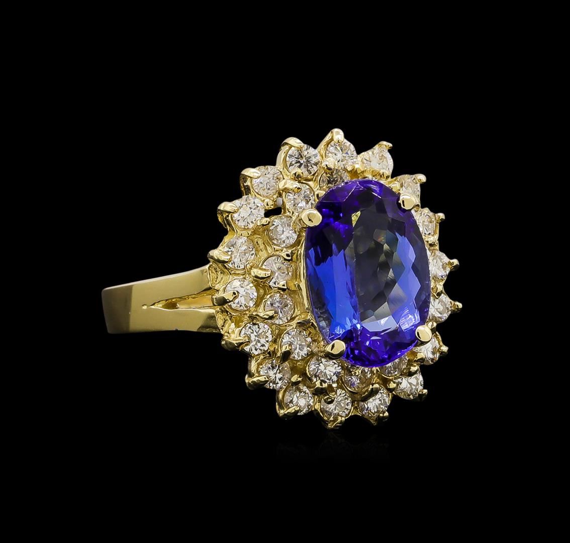One electronically tested 14KT yellow gold ladies cast tanzanite and diamond ring with a bright polish finish. Identified with markings of "14KT". Condition is new. Containing: One prong set oval modified brilliant cut natural tanzanite, measuring 10.50 x 7.20 x 4.68mm, approximate weight of 2.49ct., clarity is eye clean, type I, medium, very slightly grayish, violet color, (GIA V 5/3), cut is very good. Thirty-Two prong set round brilliant cut diamonds, measuring 1.70 - 1.74 x 1.03mm (depth est.) approximate total weight of 32 Stones = 0.59ct. Clarity: I-1 to I-2. Color: L - M, Cut is Good. Colored gemstones are presumed to have been subjected to commonly used enhancement processes. All diamonds and colored gemstones are graded in the mounting, unless otherwise stated. Total Weight of Colored Stones 2.49ct. Total Weight of Diamonds 0.59ct. Total Weight of Ring 5.90 grams. GGL Appraised at $4,245.00.