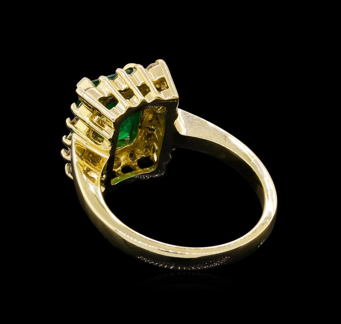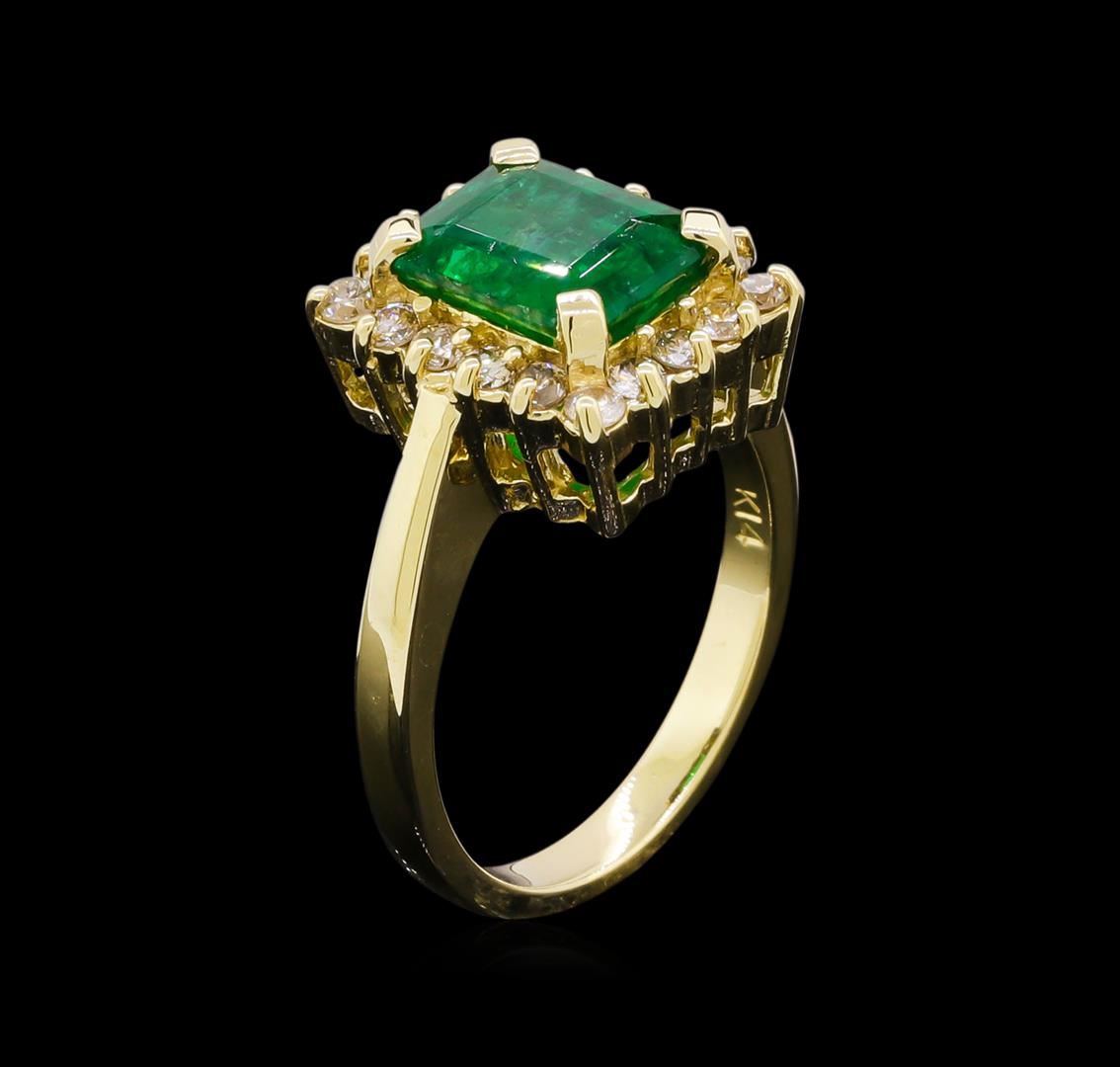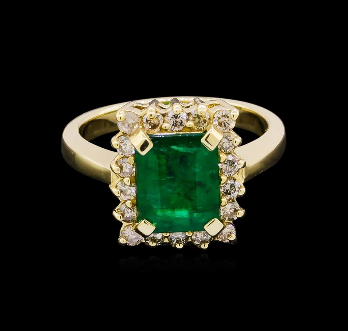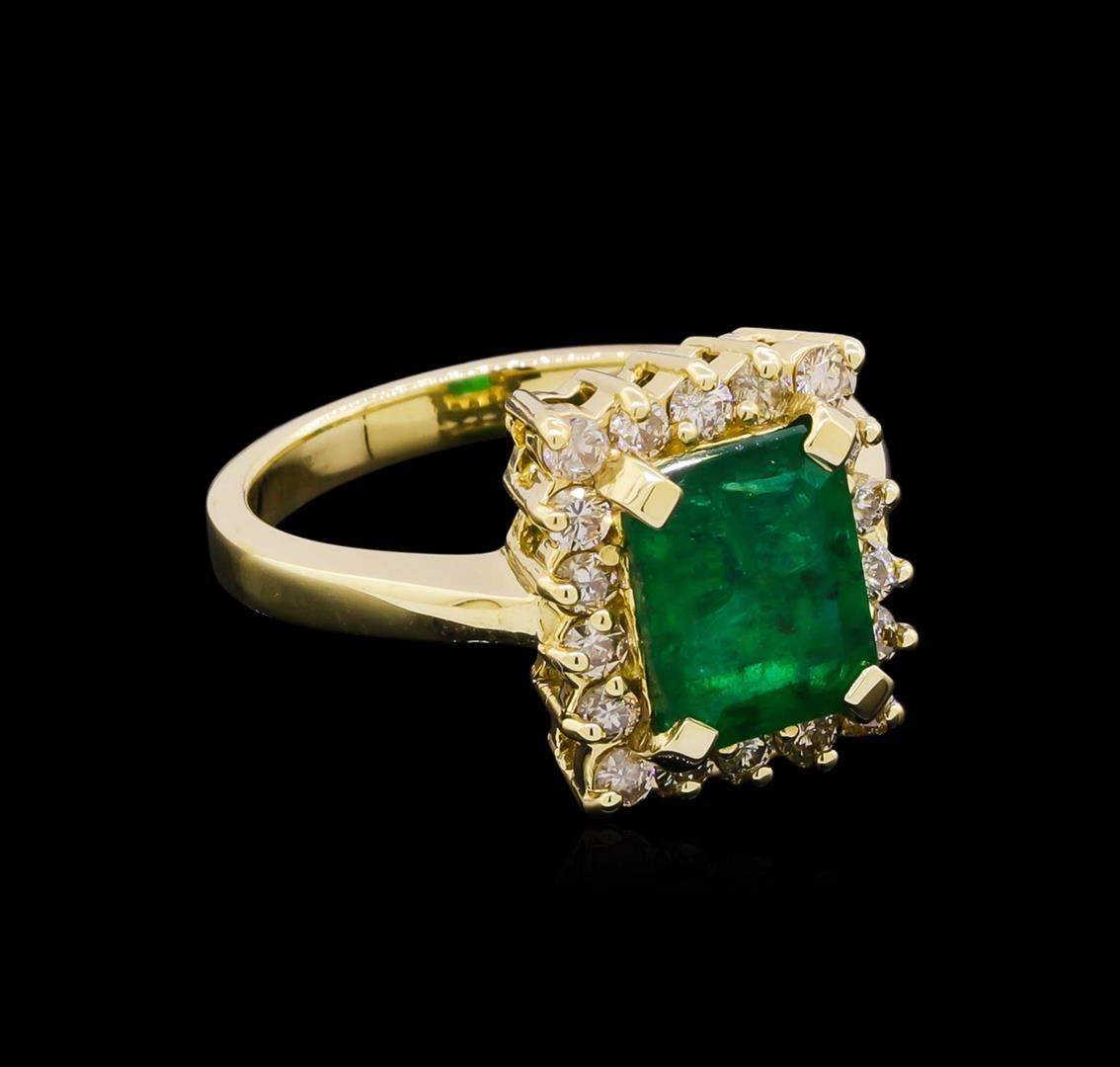 One electronically tested 14KT yellow gold ladies cast emerald and diamond ring with a bright polish finish. The featured emerald is set within a diamond bezel, completed by a two and one-half millimeter wide band. Identified with markings of "K14". Condition is new, good workmanship. Containing: One prong set rectangular step cut natural emerald, measuring 9.00 x 7.40 x 4.60mm, approximate weight of 2.50ct., clarity is heavily included, type III, medium dark, very slightly grayish, very slightly bluish green color, (GIA vslbG 6/3), cut is good. Transmitting light with a minimum of distortion, transparent to translucent. Naturally occurring internal & external characteristics are present. Indications of oil, & opticon residue. Graded in the setting. Eighteen prong set round brilliant cut diamonds, measuring 2.00 - 2.00 x 1.20mm (depth est.) approximate. Total Weight of 18 Stones = 0.63ct. Graded in the setting. Clarity: SI-2 to I-1 . Color: H - J. Total Weight of Colored Stones 2.50ct. Total Weight of Diamonds 0.63ct. AIG Appraised at $5,625.00.