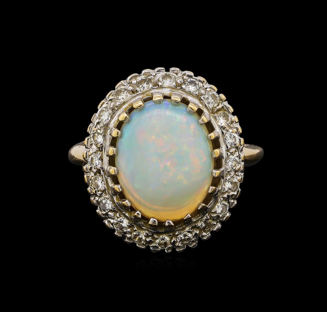 One electronically tested 14KT yellow gold ladies cast opal and diamond ring. The featured opal is set within a diamond bezel, completed by a one and one-half millimeter wide band. Bright polish finish with rhodium accents. Identified with markings of "14K". Condition is good. Containing: One crystal opal that is cut in a oval shaped cabochon and is prong set, measuring 12.00 mm long x 9.34 mm wide, and 3.55 mm thick and the approximate weight is 2.50 carats. The opal has a somewhat bright, multicolor play of color (fire) in a flashfire pattern; a medium dome; a good cut; slightly included; minor dull spot in its brightness and pattern; and is somewhat directional. Graded in the setting. Twenty prong set round brilliant cut diamonds, measuring 1.60 - 1.50 x 0.93mm (depth est.) approximate total weight of 20 Stones = 0.38ct. Graded in the setting. Clarity: VS-1 to VS-2. Color: G - I. Total Weight of Diamonds 0.38ct. Total Weight of Opals 2.50ct. Total Weight of Ring 6.06 grams. AIG Appraised at $3,050.00.