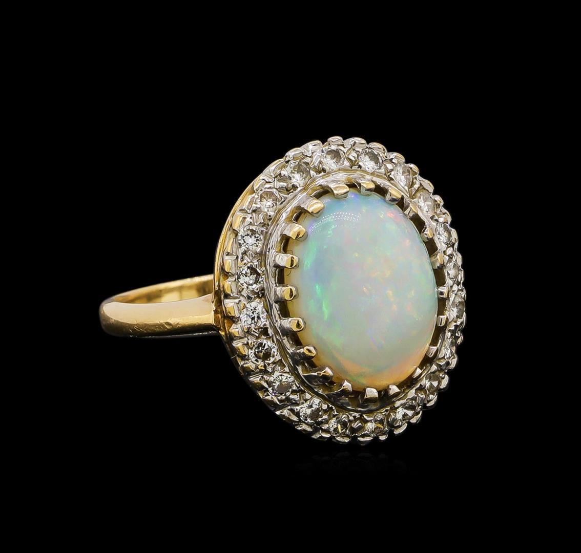 One electronically tested 14KT yellow gold ladies cast opal and diamond ring. The featured opal is set within a diamond bezel, completed by a one and one-half millimeter wide band. Bright polish finish with rhodium accents. Identified with markings of "14K". Condition is good. Containing: One crystal opal that is cut in a oval shaped cabochon and is prong set, measuring 12.00 mm long x 9.34 mm wide, and 3.55 mm thick and the approximate weight is 2.50 carats. The opal has a somewhat bright, multicolor play of color (fire) in a flashfire pattern; a medium dome; a good cut; slightly included; minor dull spot in its brightness and pattern; and is somewhat directional. Graded in the setting. Twenty prong set round brilliant cut diamonds, measuring 1.60 - 1.50 x 0.93mm (depth est.) approximate total weight of 20 Stones = 0.38ct. Graded in the setting. Clarity: VS-1 to VS-2. Color: G - I. Total Weight of Diamonds 0.38ct. Total Weight of Opals 2.50ct. Total Weight of Ring 6.06 grams. AIG Appraised at $3,050.00.