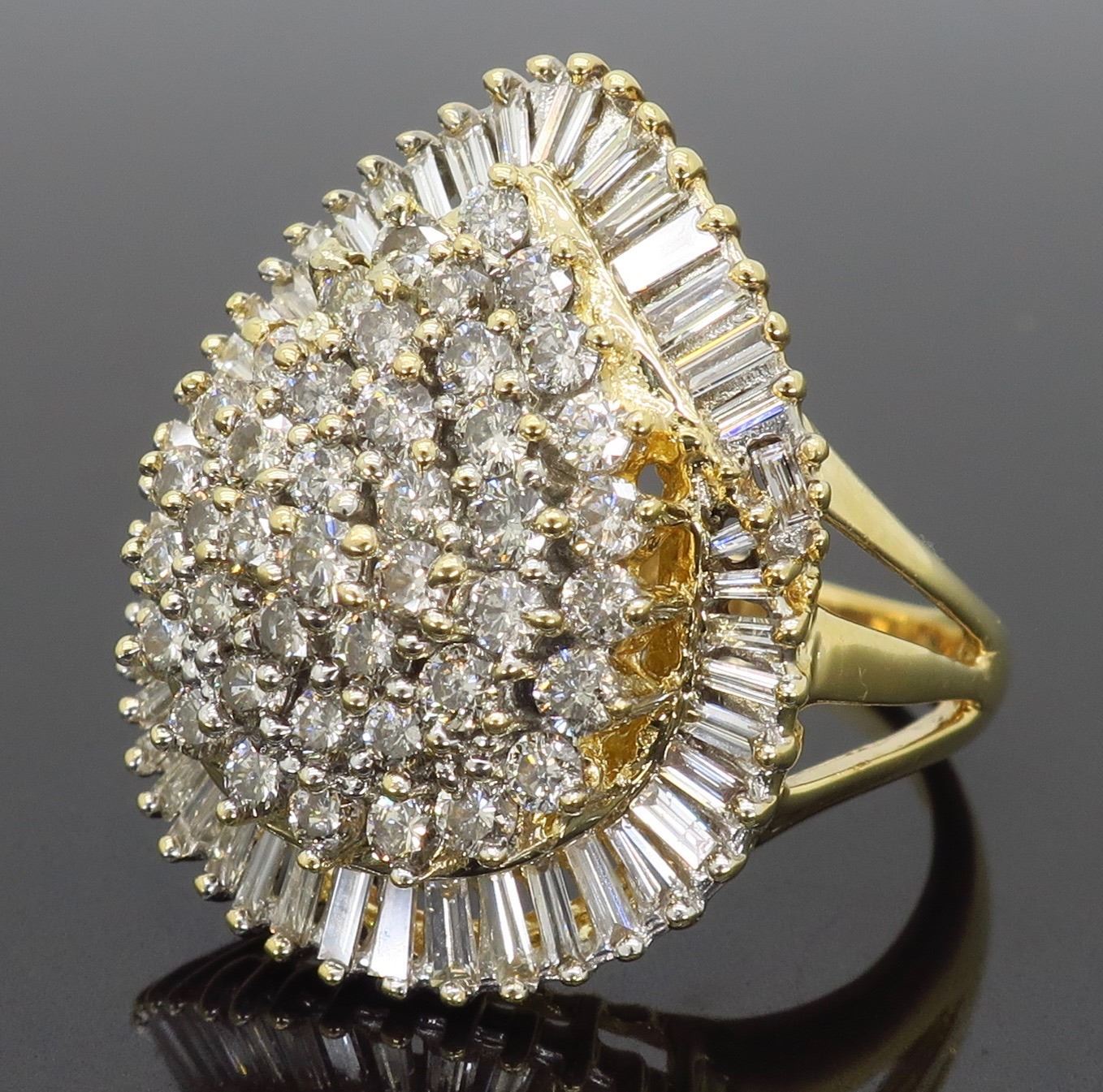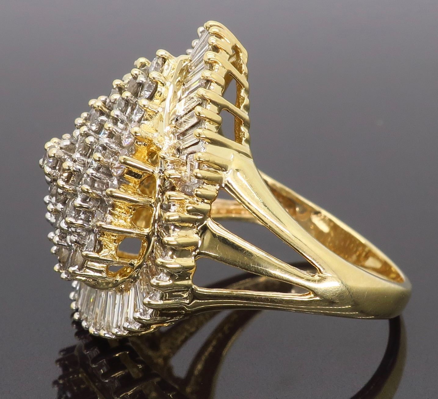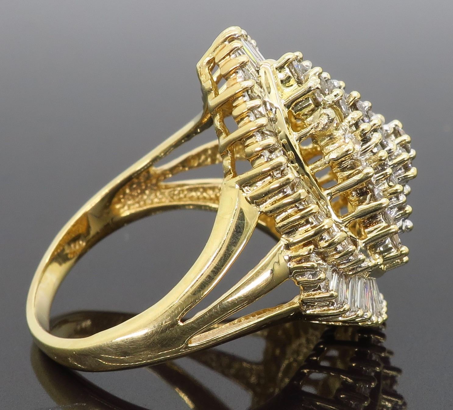 One 14KT Yellow Gold 2.50ctw Diamond Ring. (47) Baguette and (42) Round Diamonds with a total weight of 2.50cts with a color of G-K and clarity of SI-2 to I-2. Total weight of this ring is 9.2 grams. Ring size is 7.