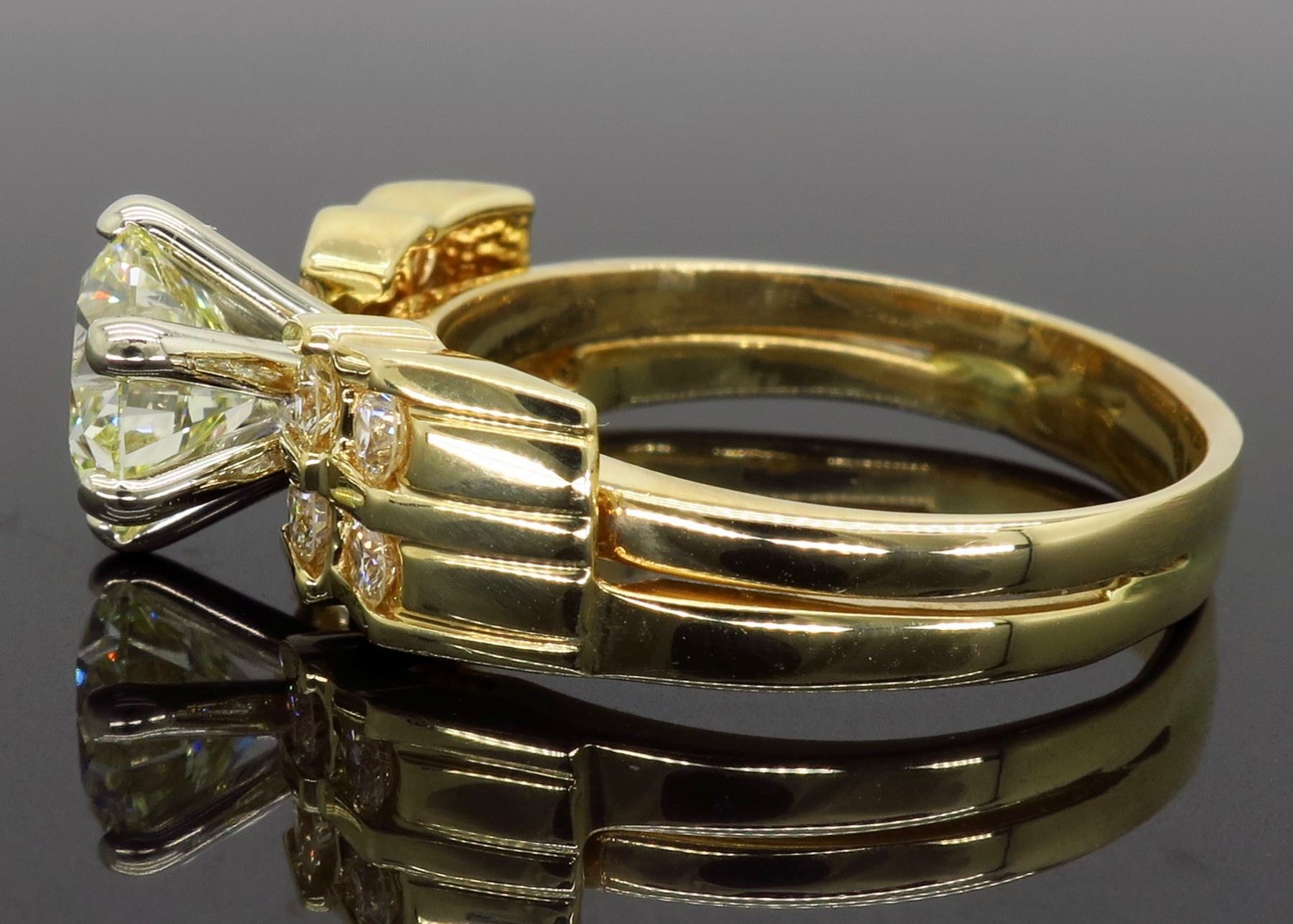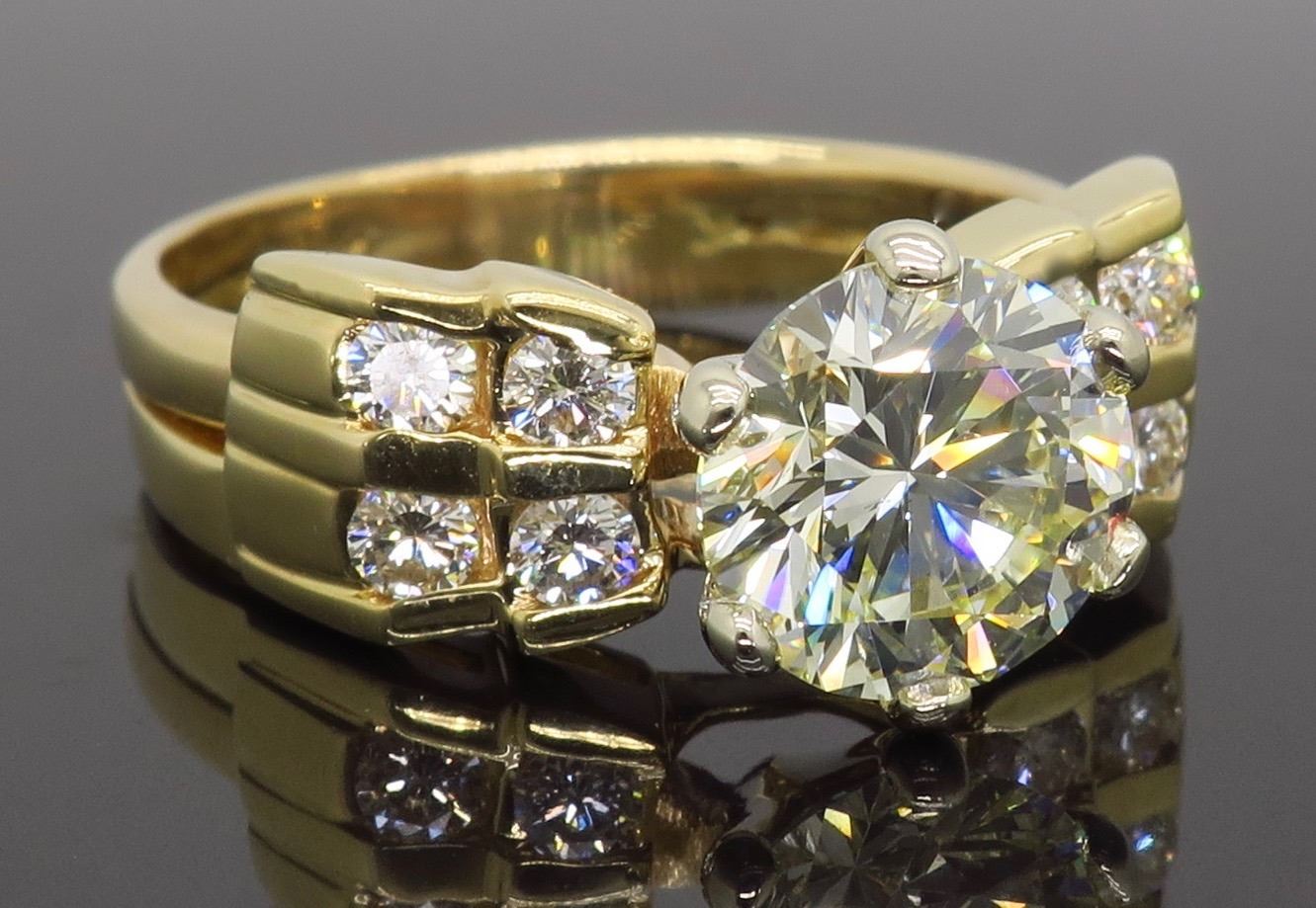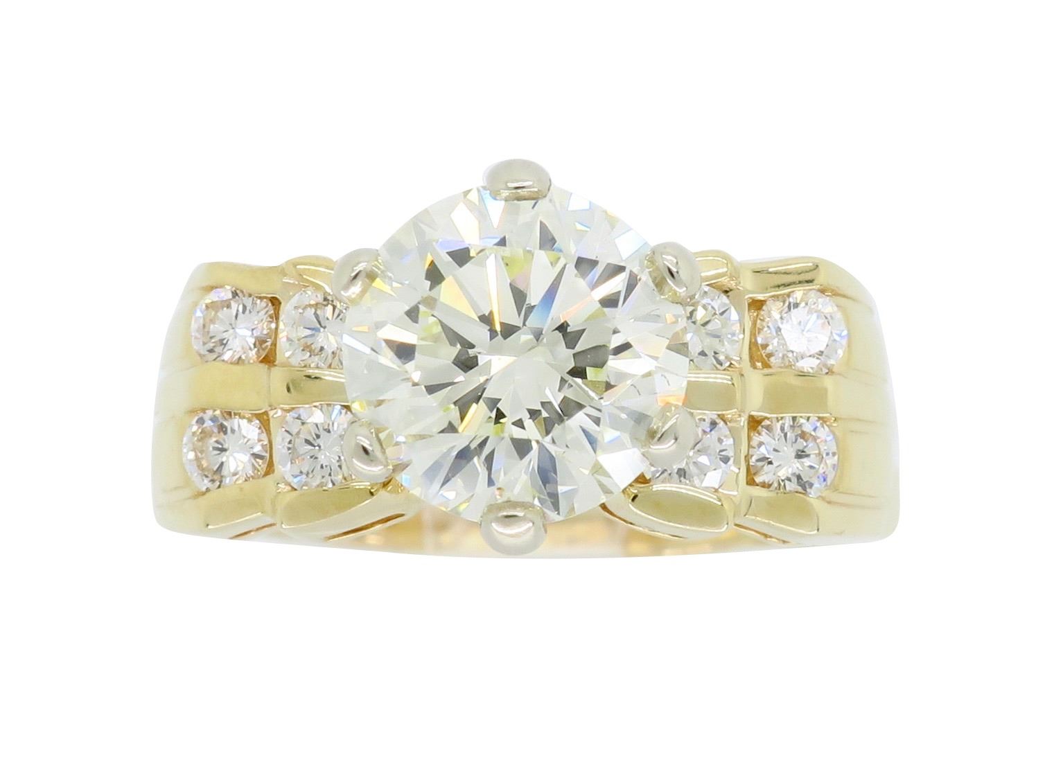 One 14KT Yellow Gold 2.50ctw Diamond Ring. (1) Round Center Diamond with a total weight of 2.00cts with a color of M-N and clarity of SI-1. (8) round side Diamonds with a color of G-J and clarity of VS-2 to SI-2. Total weight of this ring is 7.1 grams. Ring size is 8.75.