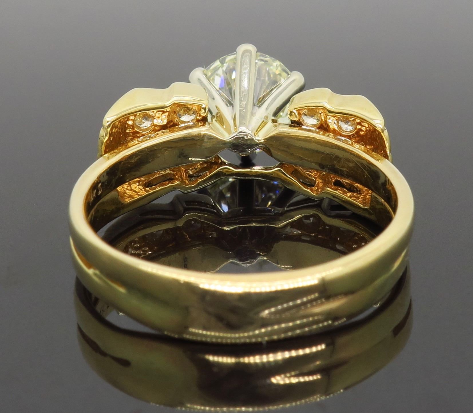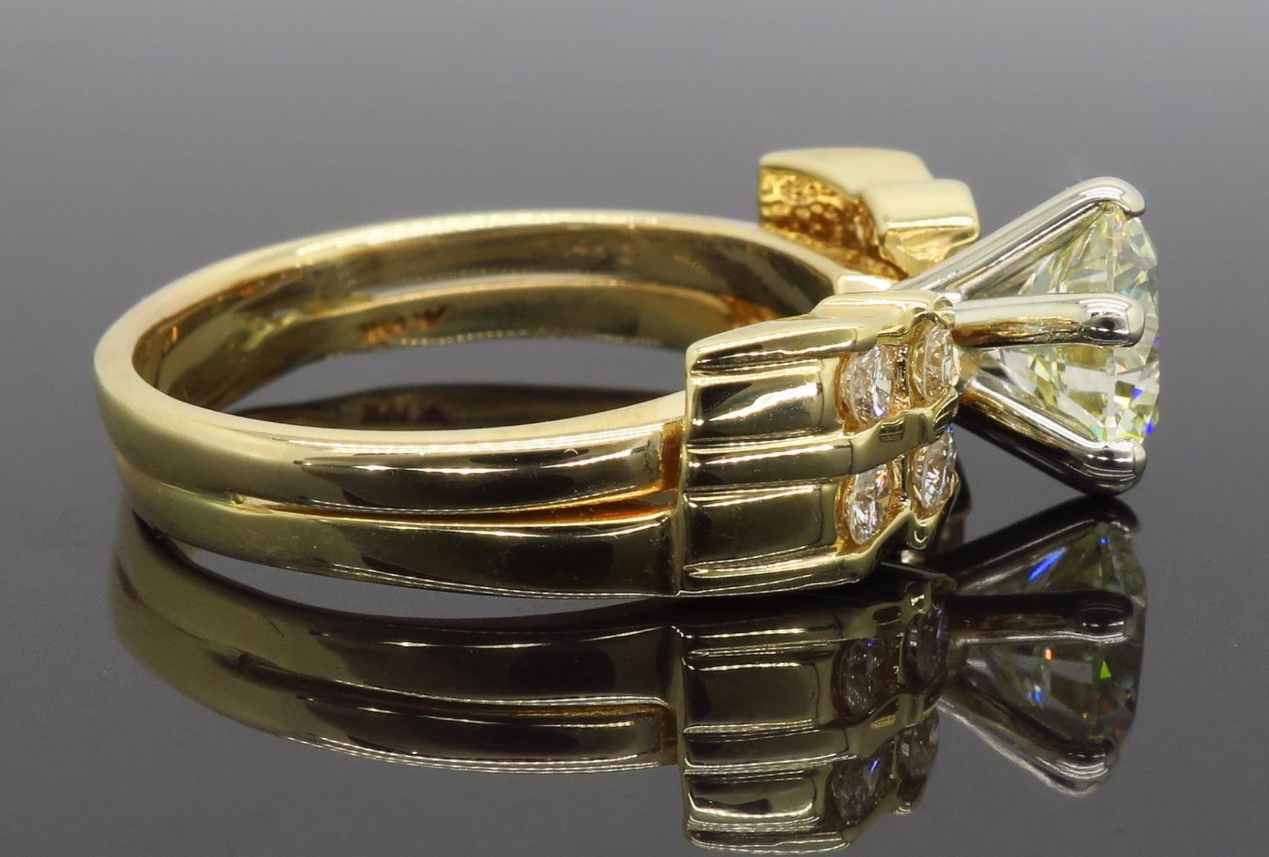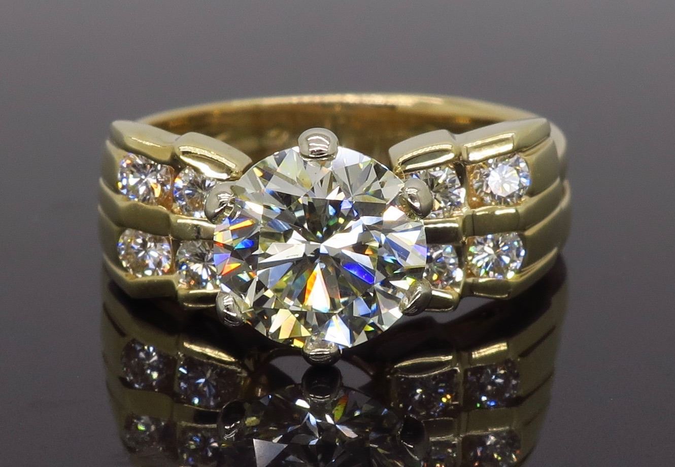 One 14KT Yellow Gold 2.50ctw Diamond Ring. (1) Round Center Diamond with a total weight of 2.00cts with a color of M-N and clarity of SI-1. (8) round side Diamonds with a color of G-J and clarity of VS-2 to SI-2. Total weight of this ring is 7.1 grams. Ring size is 8.75.