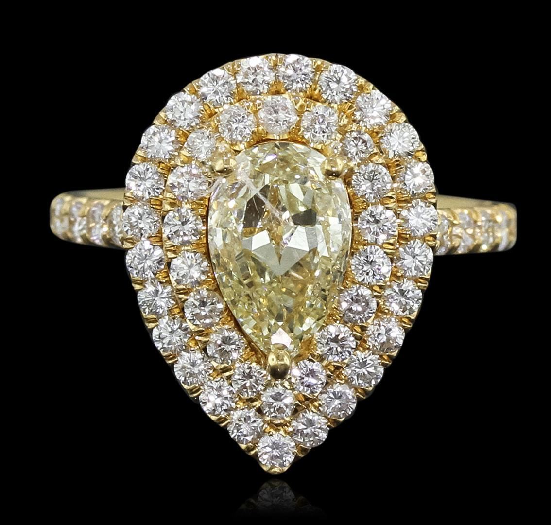 One electronically tested 14KT yellow gold Ladies combination cast & assembled engagement ring with a bright polish finish. Condition is new. Containing: One prong set pear shaped cut diamond, measuring 10.00 x 6.00 x 3.78mm (depth est.) approximate weight of 1.30ct. Clarity: VS-2, Cut is Very Good. Fifty-Seven prong set round brilliant cut diamonds, measuring 1.80 - 1.80 x 1.08mm (depth est.) approximate. Total Weight of 57 Stones = 1.21ct. Clarity: SI-1 to SI-2. Color: I - J, Cut is Good. Total Weight of Diamonds 2.52ct. Total Weight of Ring 6.20 grams. GGL Appraised.