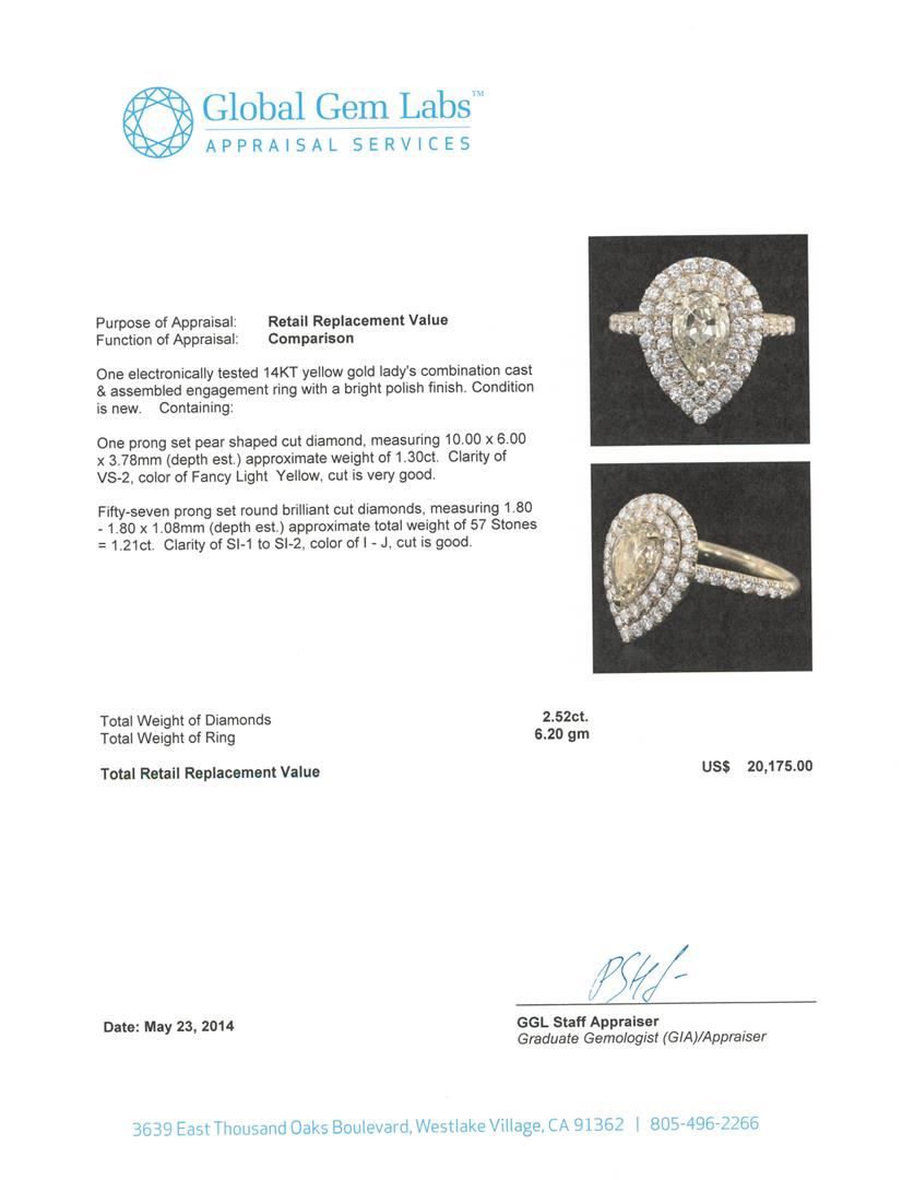 One electronically tested 14KT yellow gold Ladies combination cast & assembled engagement ring with a bright polish finish. Condition is new. Containing: One prong set pear shaped cut diamond, measuring 10.00 x 6.00 x 3.78mm (depth est.) approximate weight of 1.30ct. Clarity: VS-2, Cut is Very Good. Fifty-Seven prong set round brilliant cut diamonds, measuring 1.80 - 1.80 x 1.08mm (depth est.) approximate. Total Weight of 57 Stones = 1.21ct. Clarity: SI-1 to SI-2. Color: I - J, Cut is Good. Total Weight of Diamonds 2.52ct. Total Weight of Ring 6.20 grams. GGL Appraised.