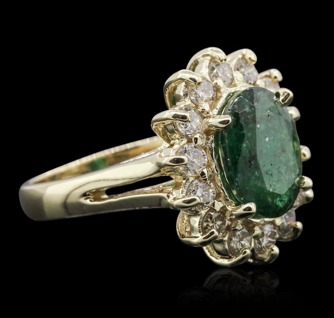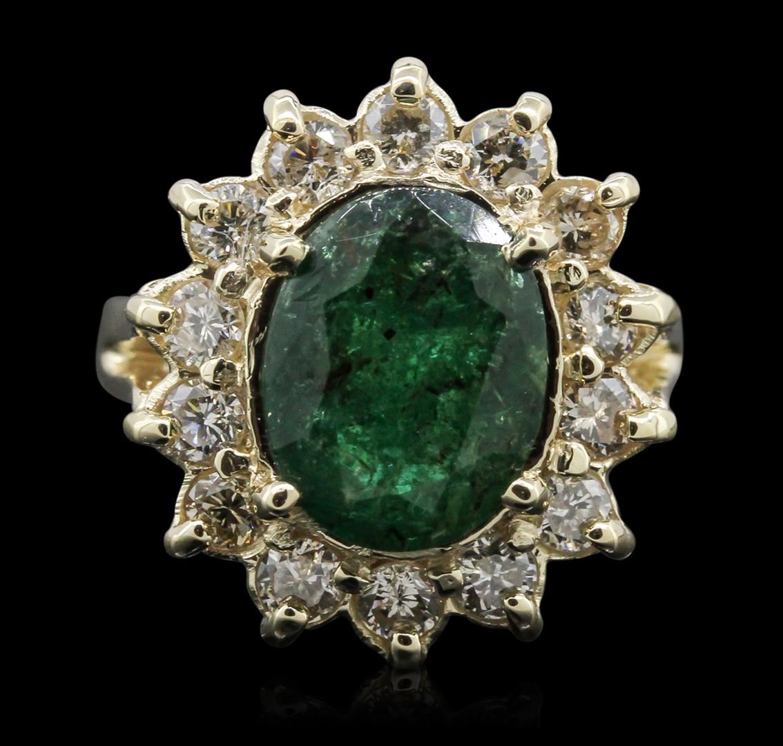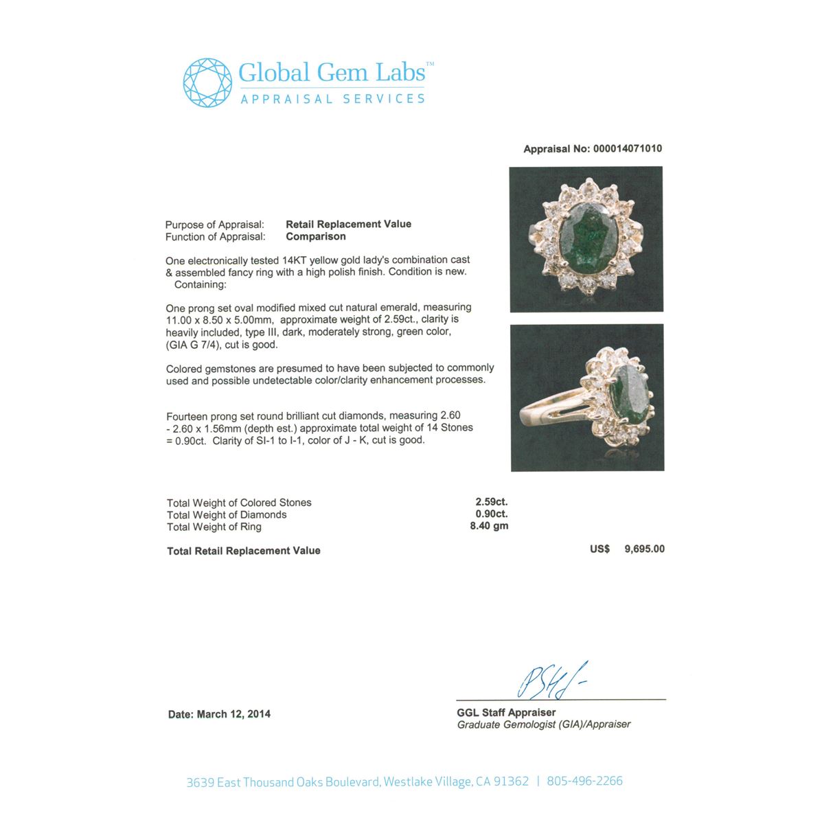 One electronically tested 14KT yellow gold Ladies combination cast & assembled fancy ring with a high polish finish. Condition is new. Containing: One prong set oval modified mixed cut natural emerald, measuring 11.00 x 8.50 x 5.00mm, approximate weight of 2.59ct., clarity is heavily included, type III, dark, moderately strong, green color, (GIA G 7/4), cut is good. Colored gemstones are presumed to have been subjected to commonly used and possible undetectable color/clarity enhancement processes. Fourteen prong set round brilliant cut diamonds, measuring 2.60 - 2.60 x 1.56mm (depth est.) approximate total weight of 14 Stones = 0.90ct. Clarity of SI-1 to I-1, Color of J - K, Cut is Good. Total Weight of Colored Stones 2.59ct. Total Weight of Diamonds 0.90ct. Total Weight of Ring 8.40 grams. GGL Appraised at $9,695.00.