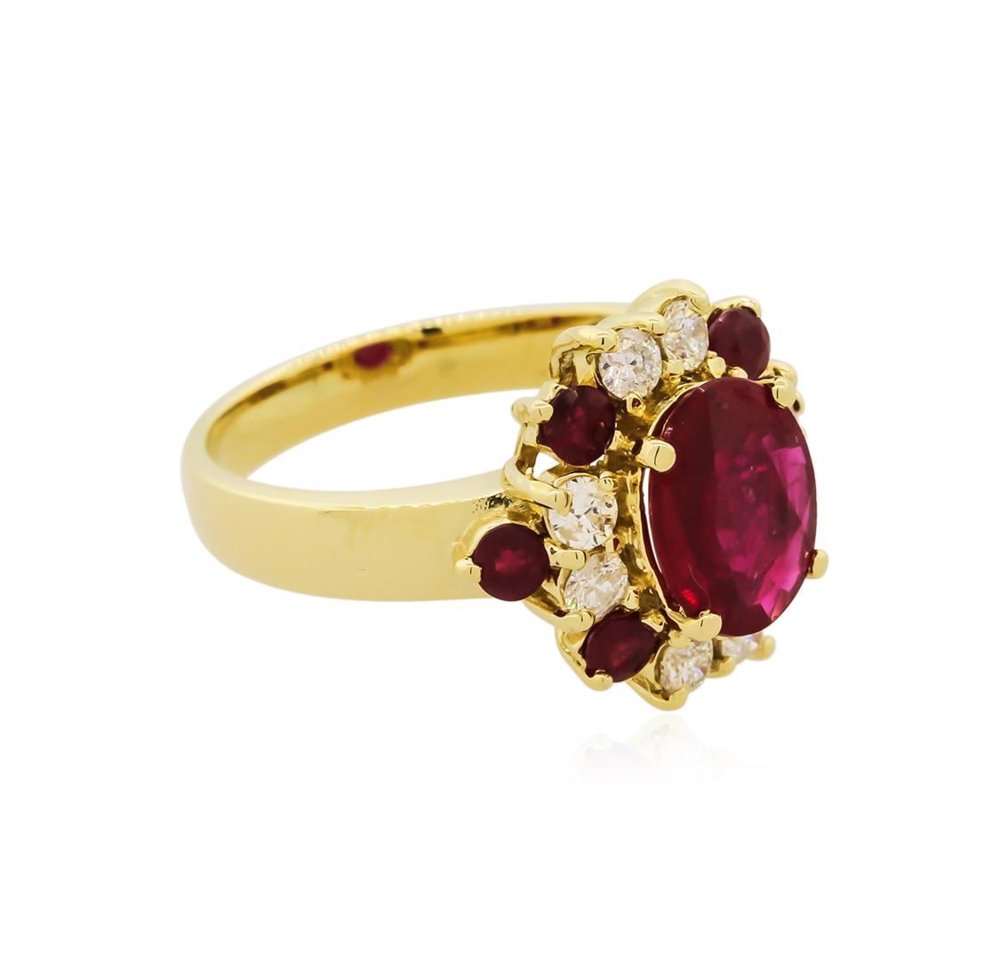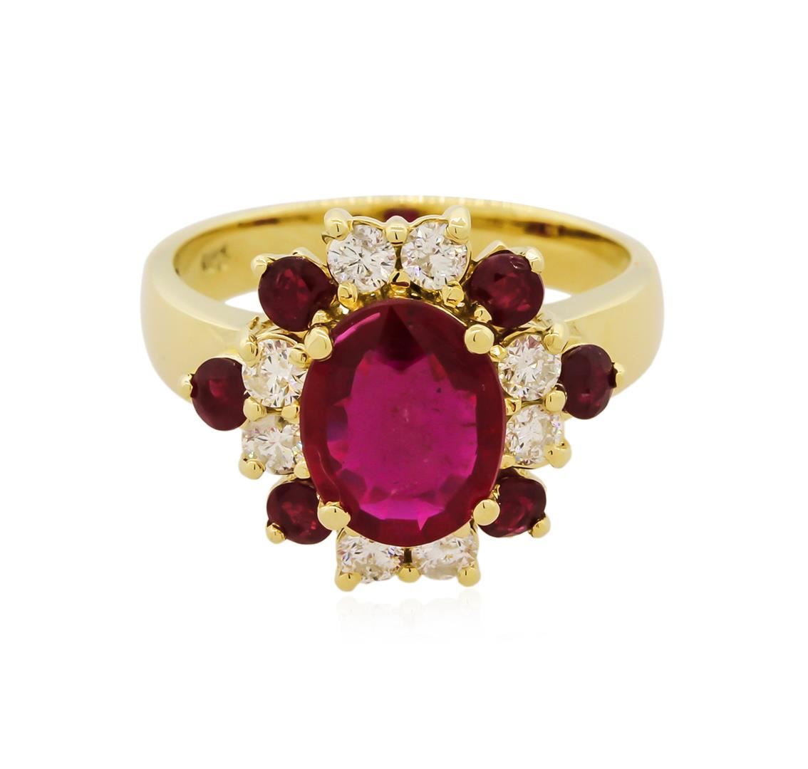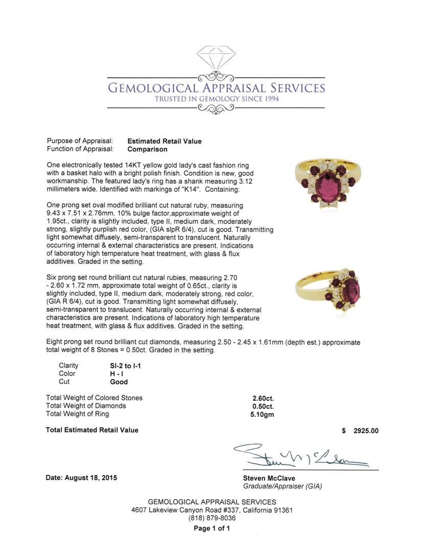 One electronically tested 14KT yellow gold lady's cast fashion ring with a basket halo with a bright polish finish. The featured lady's ring has a shank measuring 3.12 millimeters wide. Identified with markings of "K14". Condition is new, good workmanship. Containing: One prong set oval modified brilliant cut natural ruby, measuring 9.43 x 7.51 x 2.76mm, 10% bulge factor, approximate weight of 1.95ct., clarity is slightly included, type II, medium dark, moderately strong, slightly purplish red color, (GIA slpR 6/4), cut is good. Transmitting light somewhat diffusely, semi-transparent to translucent. Naturally occurring internal & external characteristics are present. Indications of laboratory high temperature heat treatment, with glass & flux additives. Graded in the setting. Six prong set round brilliant cut natural rubies, measuring 2.70 - 2.60 x 1.72 mm, approximate total weight of 0.65ct., clarity is slightly included, type II, medium dark, moderately strong, red color, (GIA R 6/4), cut is good. Transmitting light somewhat diffusely, semi-transparent to translucent. Naturally occurring internal & external characteristics are present. Indications of laboratory high temperature heat treatment, with glass & flux additives. Graded in the setting. Eight prong set round brilliant cut diamonds, measuring 2.50 - 2.45 x 1.61mm (depth est.) approximate total weight of 8 Stones = 0.50ct. Graded in the setting. Clarity: SI-2 to I-1. Color: H - I. Cut Good. Total Weight of Colored Stones 2.60ct. Total Weight of Diamonds 0.50ct. Total Weight of Ring 5.10gm. GAS Appraised at $2,925.00.