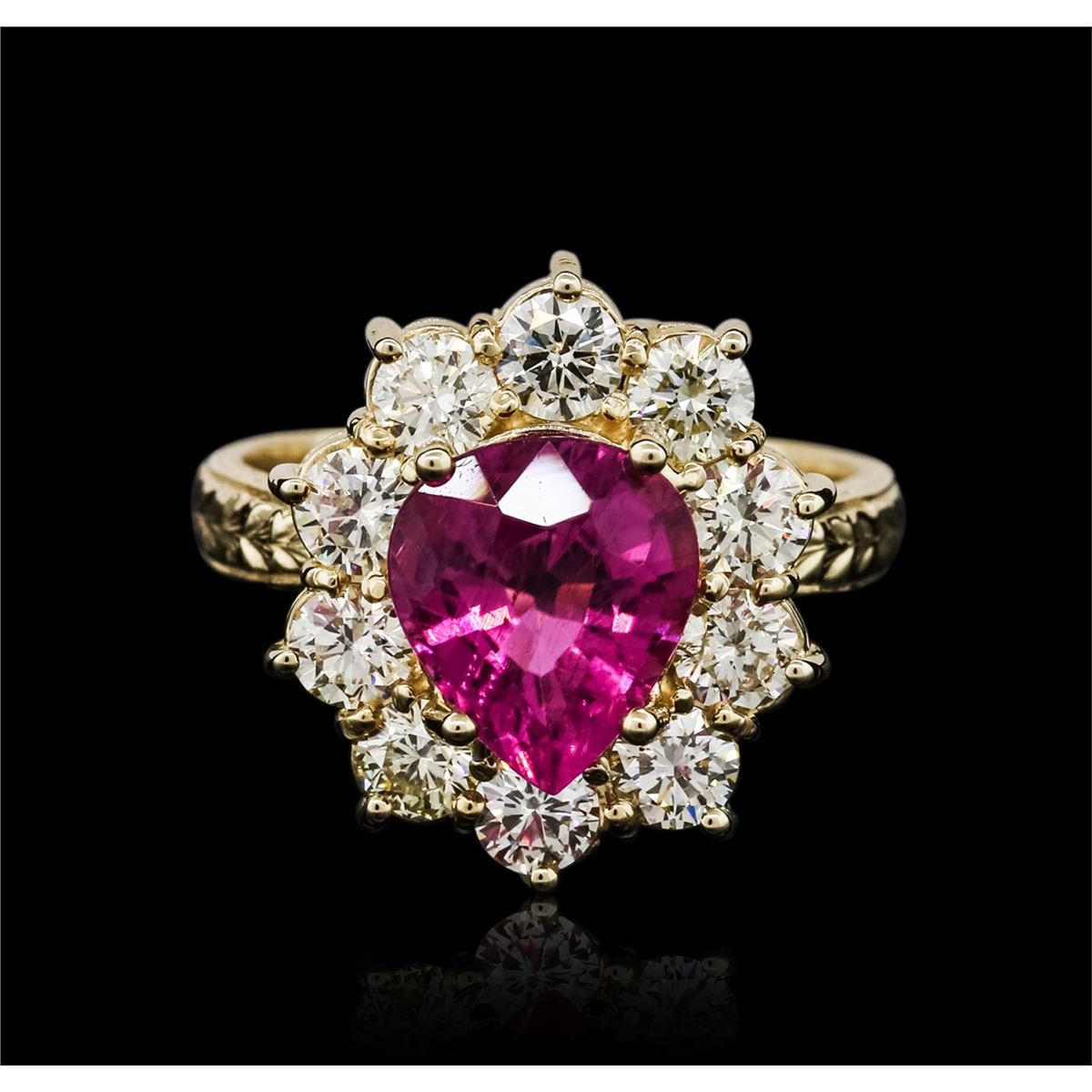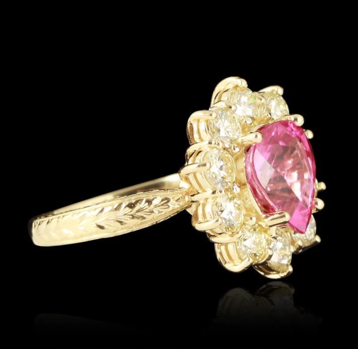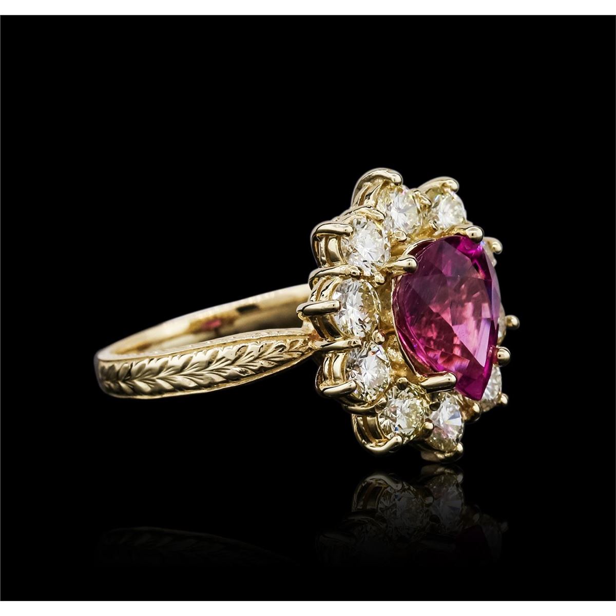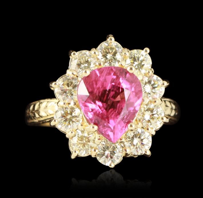 One polished, stamped, and electronically tested solid 14K yellow gold ring mounted with: 1 genuine tourmaline center stone weighing 2.61 carats and 10 genuine round full cut diamonds weighing 1.72 carats. This item weighs 6.7 grams, condition is new, excellent workmanship. AIGL Appraised at $6,100.00.