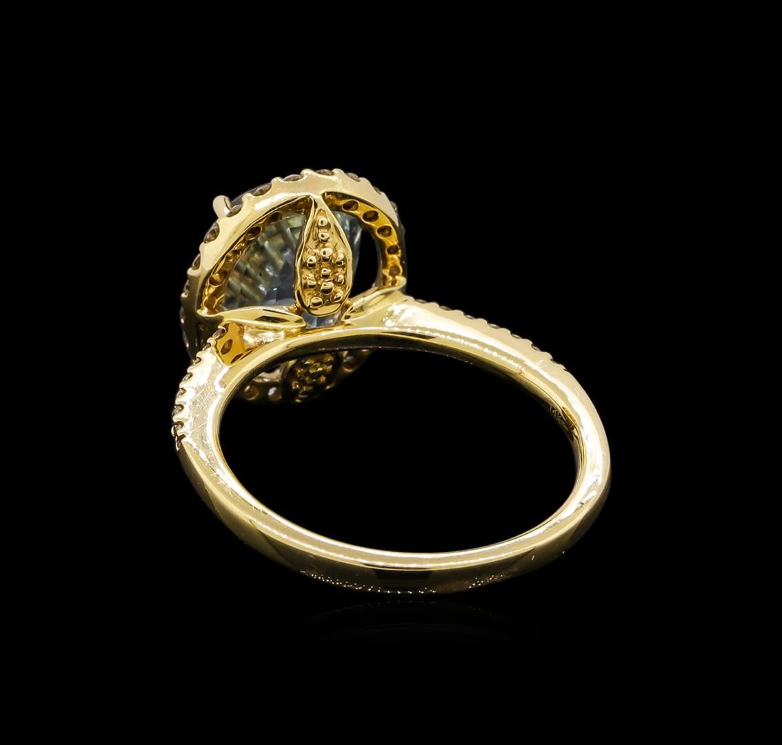 One electronically tested 14KT yellow gold ladies cast aquamarine and diamond ring with a bright polish finish. Identified with markings of "14K". Condition is new. Containing: One prong set oval modified brilliant cut natural aquamarine, measuring 10.00 x 8.40 x 5.46mm, approximate weight of 2.62ct., clarity is eye clean, type I, light, very slightly grayish, blue color, (GIA B 3/3), cut is good. Thirty-Eight prong set round brilliant cut diamonds, measuring 1.10 - 1.10 x 0.66mm (depth est.) approximate total weight of 38 Stones = 0.18ct. Clarity: SI-2 to I-1. Color: J - K, Cut is Good. Colored gemstones are presumed to have been subjected to commonly used enhancement processes. All diamonds and colored gemstones are graded in the mounting, unless otherwise stated. Total Weight of Colored Stones 2.62ct. Total Weight of Diamonds 0.18ct. Total Weight of Ring 3.80 grams. GGL Appraised at $2,745.00.