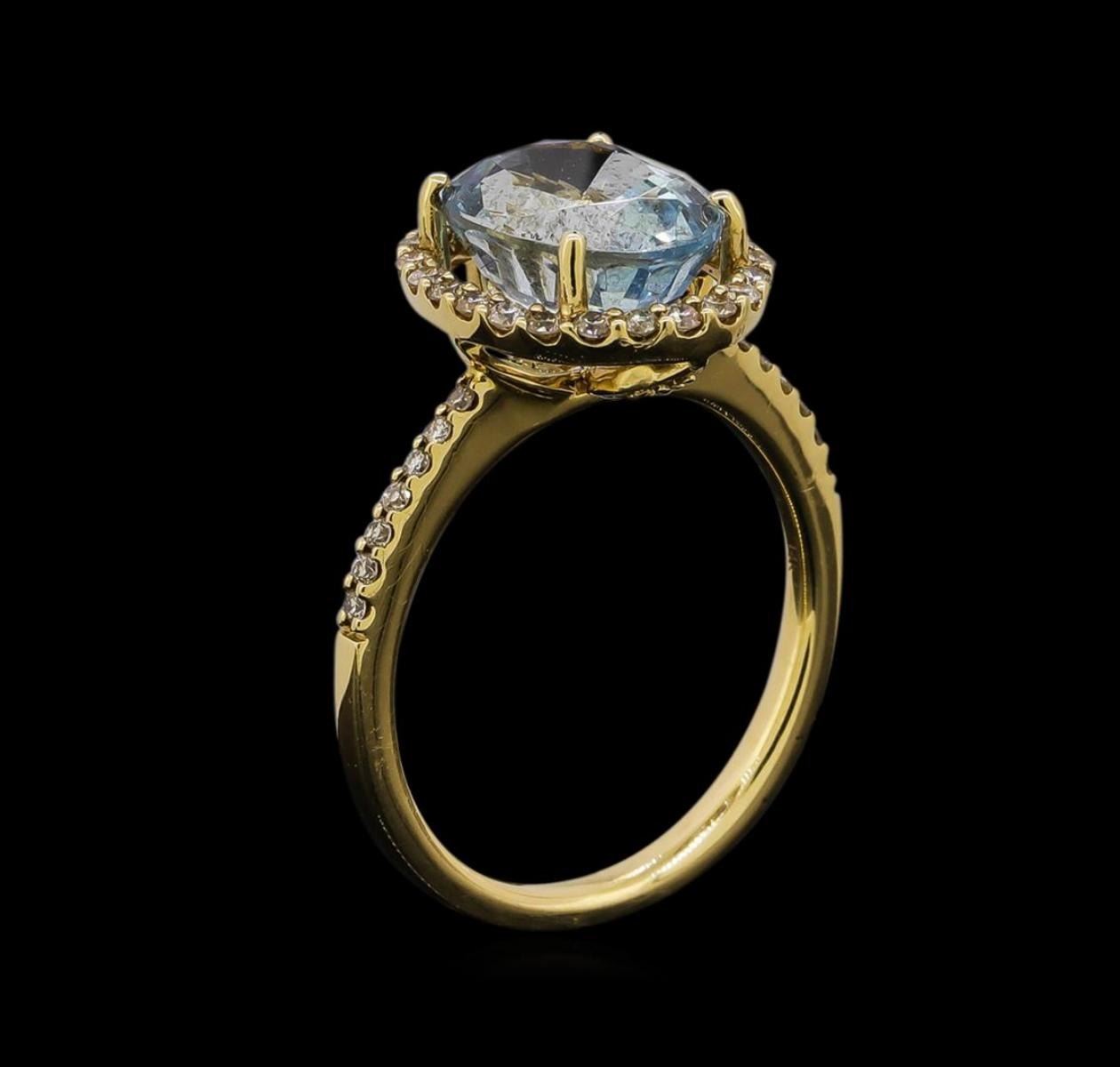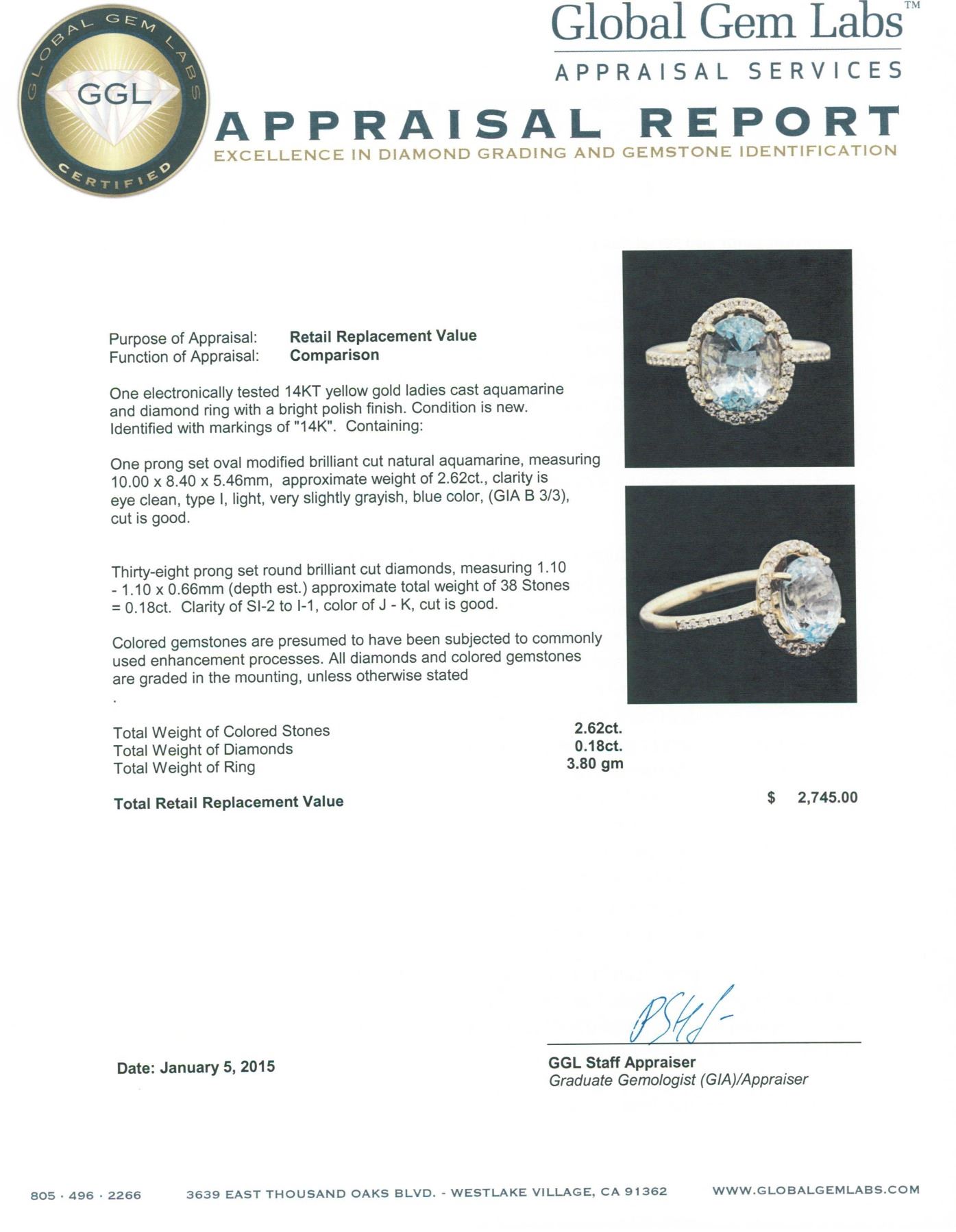 One electronically tested 14KT yellow gold ladies cast aquamarine and diamond ring with a bright polish finish. Identified with markings of "14K". Condition is new. Containing: One prong set oval modified brilliant cut natural aquamarine, measuring 10.00 x 8.40 x 5.46mm, approximate weight of 2.62ct., clarity is eye clean, type I, light, very slightly grayish, blue color, (GIA B 3/3), cut is good. Thirty-Eight prong set round brilliant cut diamonds, measuring 1.10 - 1.10 x 0.66mm (depth est.) approximate total weight of 38 Stones = 0.18ct. Clarity: SI-2 to I-1. Color: J - K, Cut is Good. Colored gemstones are presumed to have been subjected to commonly used enhancement processes. All diamonds and colored gemstones are graded in the mounting, unless otherwise stated. Total Weight of Colored Stones 2.62ct. Total Weight of Diamonds 0.18ct. Total Weight of Ring 3.80 grams. GGL Appraised.