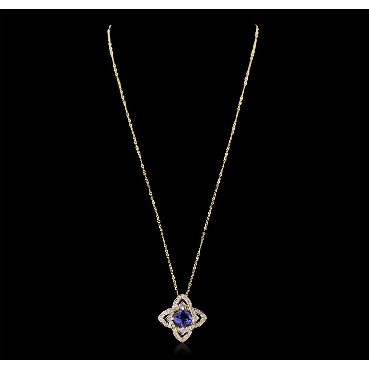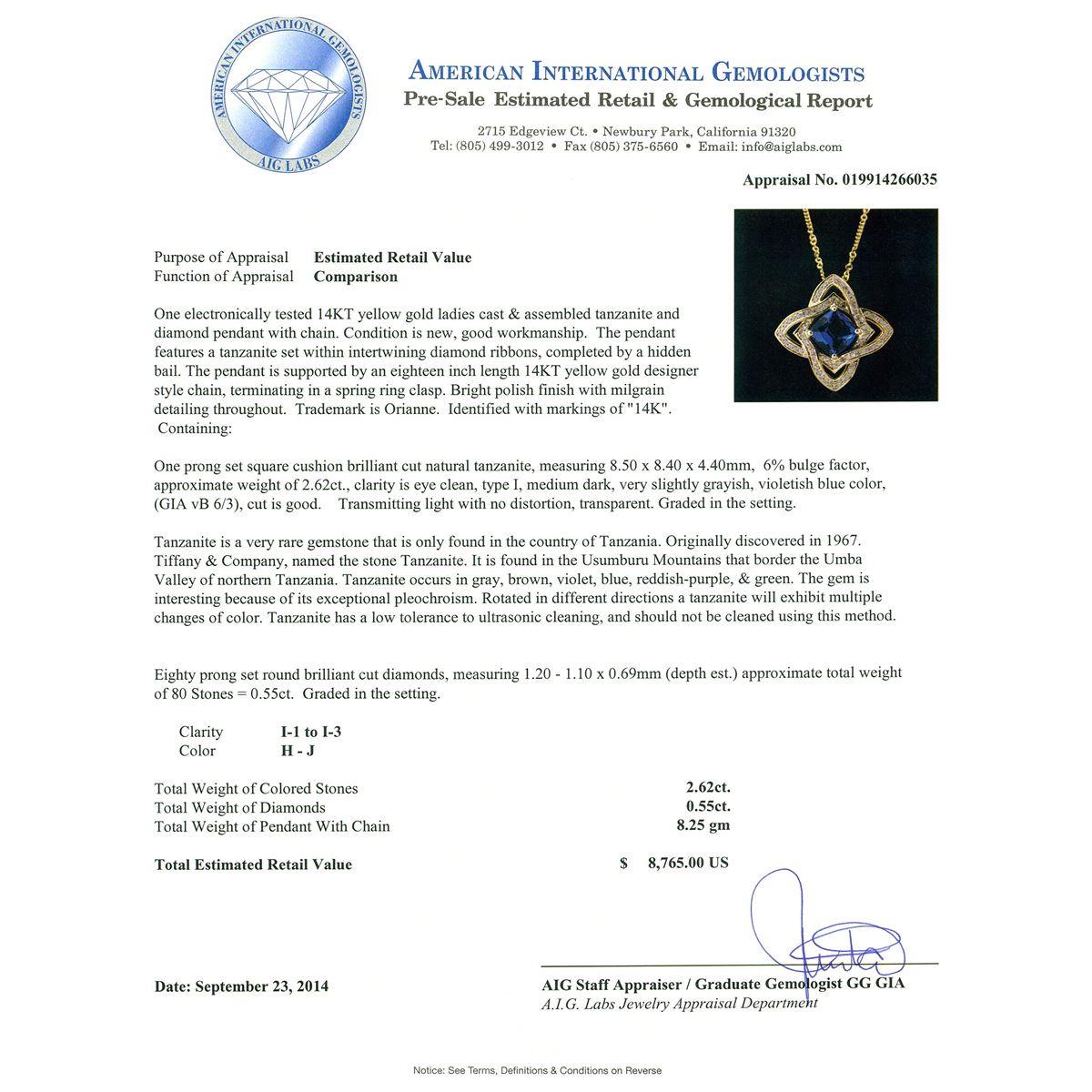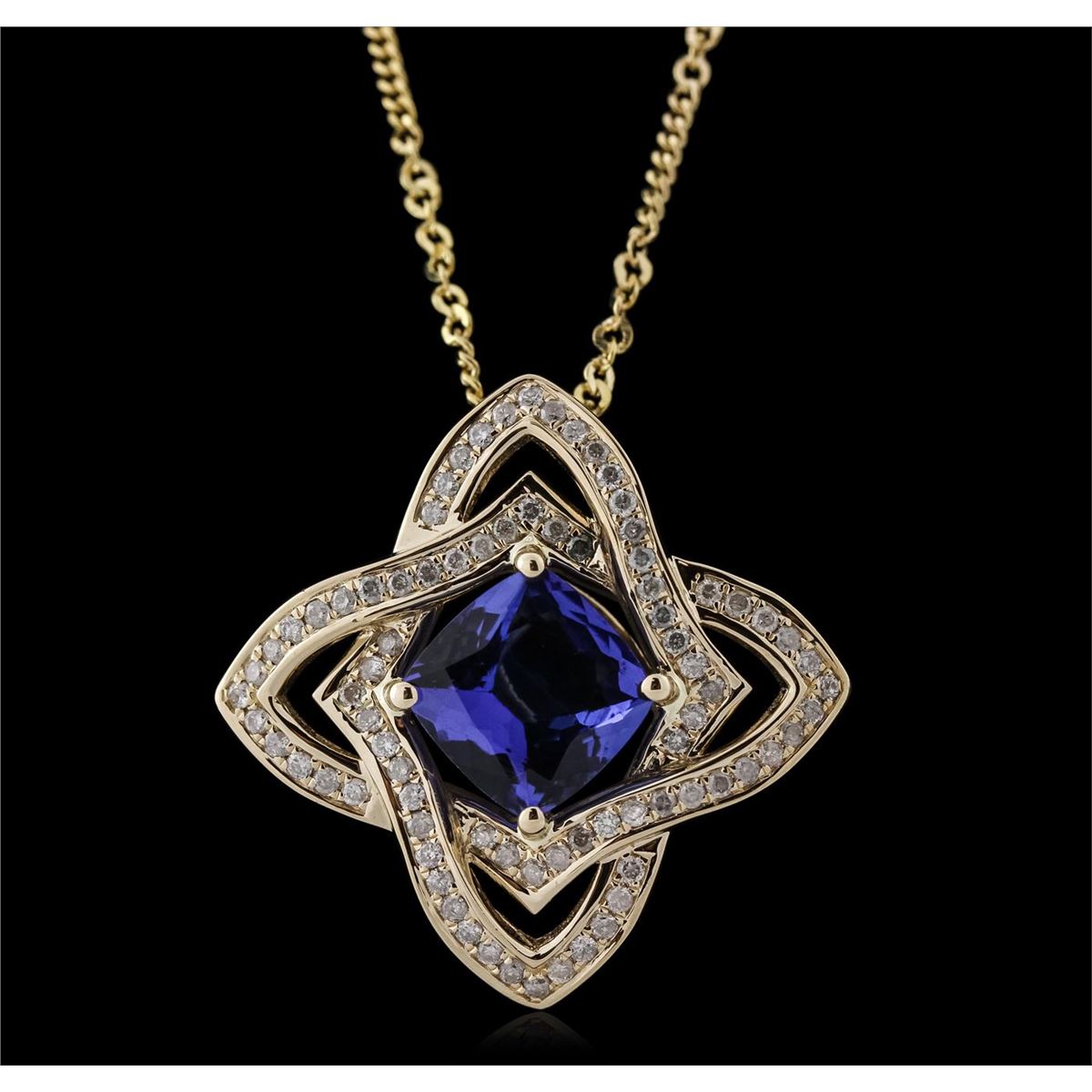 One electronically tested 14KT yellow gold ladies cast & assembled tanzanite and diamond pendant with chain. The pendant features a tanzanite set within intertwining diamond ribbons, completed by a hidden bail. The pendant is supported by an eighteen inch length 14KT yellow gold designer style chain, terminating in a spring ring clasp. Bright polish finish with milgrain detailing throughout. Trademark is Orianne. Identified with markings of "14K". Condition is new, good workmanship. Containing: One prong set square cushion brilliant cut natural tanzanite, measuring 8.50 x 8.40 x 4.40mm, 6% bulge factor, approximate weight of 2.62ct., clarity is eye clean, type I, medium dark, very slightly grayish, violetish blue color, (GIA vB 6/3), cut is good. Transmitting light with no distortion, transparent. Graded in the setting. Tanzanite is a very rare gemstone that is only found in the country of Tanzania. Originally discovered in 1967. Tiffany & Company, named the stone Tanzanite. It is found in the Usumburu Mountains that border the Umba Valley of northern Tanzania. Tanzanite occurs in gray, brown, violet, blue, reddish-purple, & green. The gem is interesting because of its exceptional pleochroism. Rotated in different directions a tanzanite will exhibit multiple changes of color. Tanzanite has a low tolerance to ultrasonic cleaning, and should not be cleaned using this method. Eighty prong set round brilliant cut diamonds, measuring 1.20 - 1.10 x 0.69mm (depth est.) approximate total weight of 80 Stones = 0.55ct. Graded in the setting. Clarity: I-1 to I-3. Color: H - J. Total Weight of Colored Stones 2.62ct. Total Weight of Diamonds 0.55ct. Total Weight of Pendant With Chain 8.25 grams. AIG Appraised at $8,765.00.
