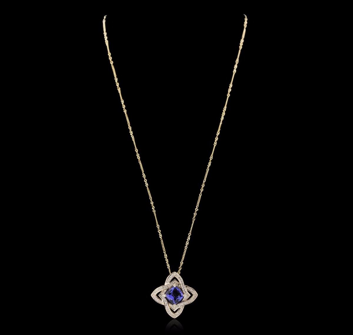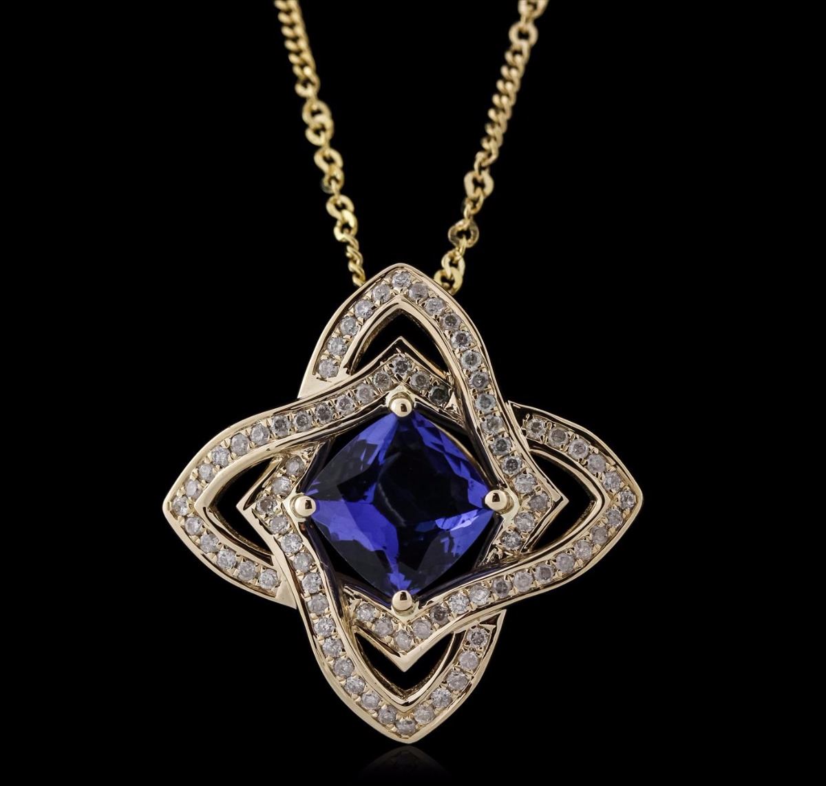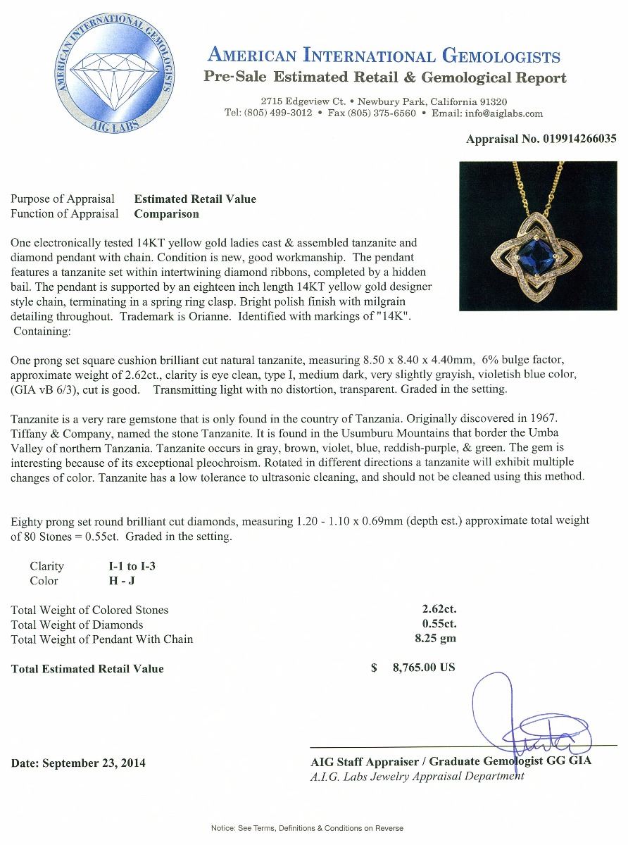 One electronically tested 14KT yellow gold ladies cast & assembled tanzanite and diamond pendant with chain. The pendant features a tanzanite set within intertwining diamond ribbons, completed by a hidden bail. The pendant is supported by an eighteen inch length 14KT yellow gold designer style chain, terminating in a spring ring clasp. Bright polish finish with milgrain detailing throughout. Trademark is Orianne. Identified with markings of "14K". Condition is new, good workmanship. Containing: One prong set square cushion brilliant cut natural tanzanite, measuring 8.50 x 8.40 x 4.40mm, 6% bulge factor, approximate weight of 2.62ct., clarity is eye clean, type I, medium dark, very slightly grayish, violetish blue color, (GIA vB 6/3), cut is good. Transmitting light with no distortion, transparent. Graded in the setting. Tanzanite is a very rare gemstone that is only found in the country of Tanzania. Originally discovered in 1967. Tiffany & Company, named the stone Tanzanite. It is found in the Usumburu Mountains that border the Umba Valley of northern Tanzania. Tanzanite occurs in gray, brown, violet, blue, reddish-purple, & green. The gem is interesting because of its exceptional pleochroism. Rotated in different directions a tanzanite will exhibit multiple changes of color. Tanzanite has a low tolerance to ultrasonic cleaning, and should not be cleaned using this method. Eighty prong set round brilliant cut diamonds, measuring 1.20 - 1.10 x 0.69mm (depth est.) approximate total weight of 80 Stones = 0.55ct. Graded in the setting. Clarity: I-1 to I-3. Color: H - J. Total Weight of Colored Stones 2.62ct. Total Weight of Diamonds 0.55ct. Total Weight of Pendant With Chain 8.25 grams. AIG Appraised at $8,765.00.