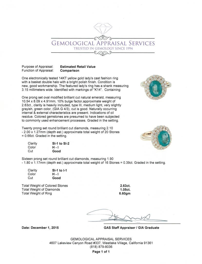 One electronically tested 14KT yellow gold lady's cast fashion ring with a basket double halo with a bright polish finish. The featured lady's ring has a shank measuring 3.15 millimeters wide. Identified with markings of "K14". Condition is new, good workmanship. Containing: One prong set oval modified brilliant cut natural emerald, measuring 10.54 x 8.09 x 4.91mm, 10%. bulge factor, approximate weight of 2.63ct., clarity is heavily included, type III, medium light, very slightly grayish, green color, (GIA G 4/3), cut is good. Naturally occurring internal & external characteristics are present. Indications of oil residue. Colored gemstones are presumed to have been subjected to commonly used enhancement processes. Graded in the setting. Twenty prong set round brilliant cut diamonds, measuring 2.10 - 2.00 x 1.27mm (depth est.) approximate total weight of 20 Stones = 0.66ct. Graded in the setting. Clarity: SI-1 to SI-2 . Color: H - I. Cut Good Sixteen prong set round brilliant cut diamonds, measuring 1.90 - 1.80 x 1.17mm (depth est.) approximate total weight of 16 Stones = 0.39ct. Graded in the setting. Clarity: SI-1 to I-1 . Color: H - I. Cut Good. Total Weight of Colored Stones 2.63ct. Total Weight of Diamonds 1.05ct. Total Weight of Ring 6.60 grams. GAS Appraised.