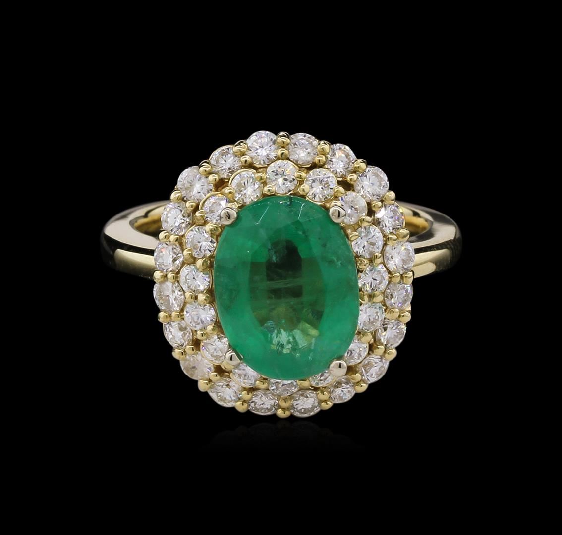 One electronically tested 14KT yellow gold lady's cast fashion ring with a basket double halo with a bright polish finish. The featured lady's ring has a shank measuring 3.15 millimeters wide. Identified with markings of "K14". Condition is new, good workmanship. Containing: One prong set oval modified brilliant cut natural emerald, measuring 10.54 x 8.09 x 4.91mm, 10%. bulge factor, approximate weight of 2.63ct., clarity is heavily included, type III, medium light, very slightly grayish, green color, (GIA G 4/3), cut is good. Naturally occurring internal & external characteristics are present. Indications of oil residue. Colored gemstones are presumed to have been subjected to commonly used enhancement processes. Graded in the setting. Twenty prong set round brilliant cut diamonds, measuring 2.10 - 2.00 x 1.27mm (depth est.) approximate total weight of 20 Stones = 0.66ct. Graded in the setting. Clarity: SI-1 to SI-2 . Color: H - I. Cut Good Sixteen prong set round brilliant cut diamonds, measuring 1.90 - 1.80 x 1.17mm (depth est.) approximate total weight of 16 Stones = 0.39ct. Graded in the setting. Clarity: SI-1 to I-1 . Color: H - I. Cut Good. Total Weight of Colored Stones 2.63ct. Total Weight of Diamonds 1.05ct. Total Weight of Ring 6.60 grams. GAS Appraised.