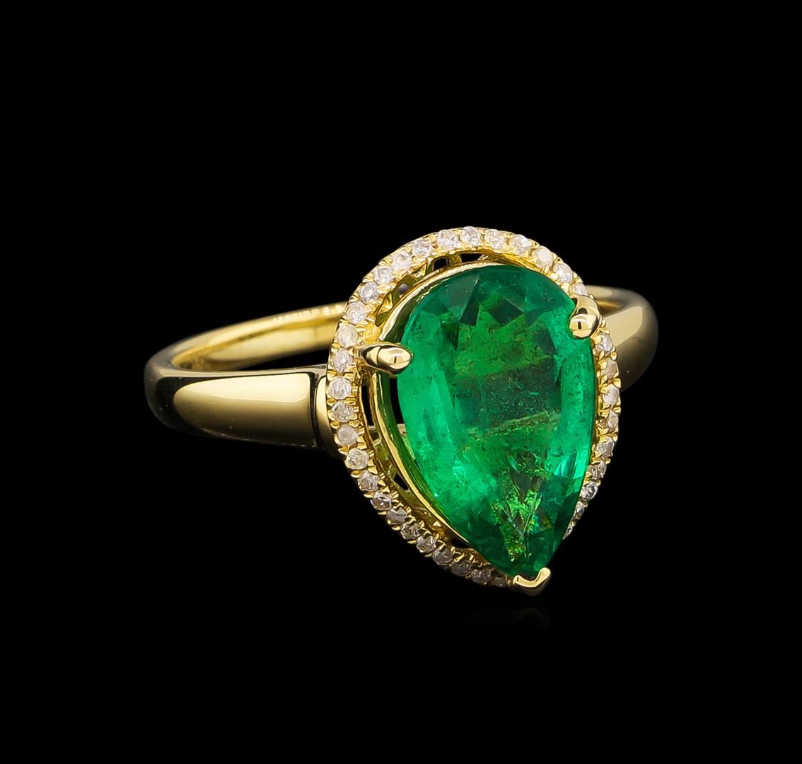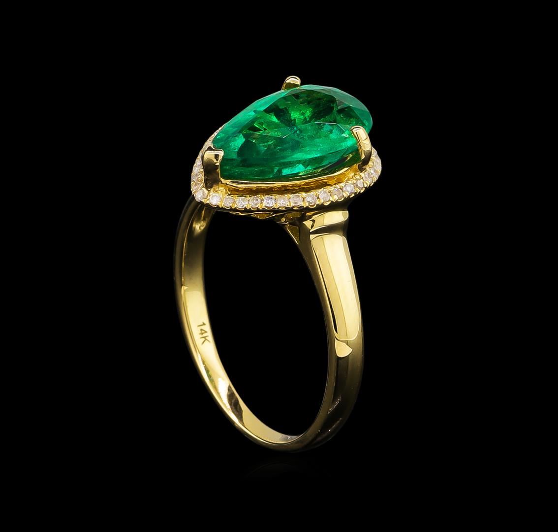 One electronically tested 14KT yellow gold ladies cast emerald and diamond ring with a bright polish finish. The emerald is set within a diamond bezel supported by tapering shoulders, completed by a one and one-half millimeter wide band. Trademark is Orianne. Identified with markings of "14K". Condition is new, good workmanship. Containing: One prong set pear mixed cut natural emerald, measuring 13.00 x 7.80 x 4.50mm, 8%. bulge factor, approximate weight of 2.68ct., clarity is heavily included, type III, medium dark, moderately strong, very slightly bluish green color, (GIA vslbG 6/4), cut is good. Transmitting light with a minimum of distortion, transparent. Naturally occurring internal & external characteristics are present. Indications of oil residue. Graded in the setting. Thirty-Nine prong set round brilliant cut diamonds, measuring 1.10 - 1.00 x 0.63mm (depth est.) approximate. Total Weight of 39 Stones = 0.26ct. Graded in the setting. Clarity: I-1 to I-2 . Color: G - I. Total Weight of Colored Stones 2.68ct. Total Weight of Diamonds 0.26ct. Total Weight of Ring 3.69gm. AIG Appraised at $6,925.00.