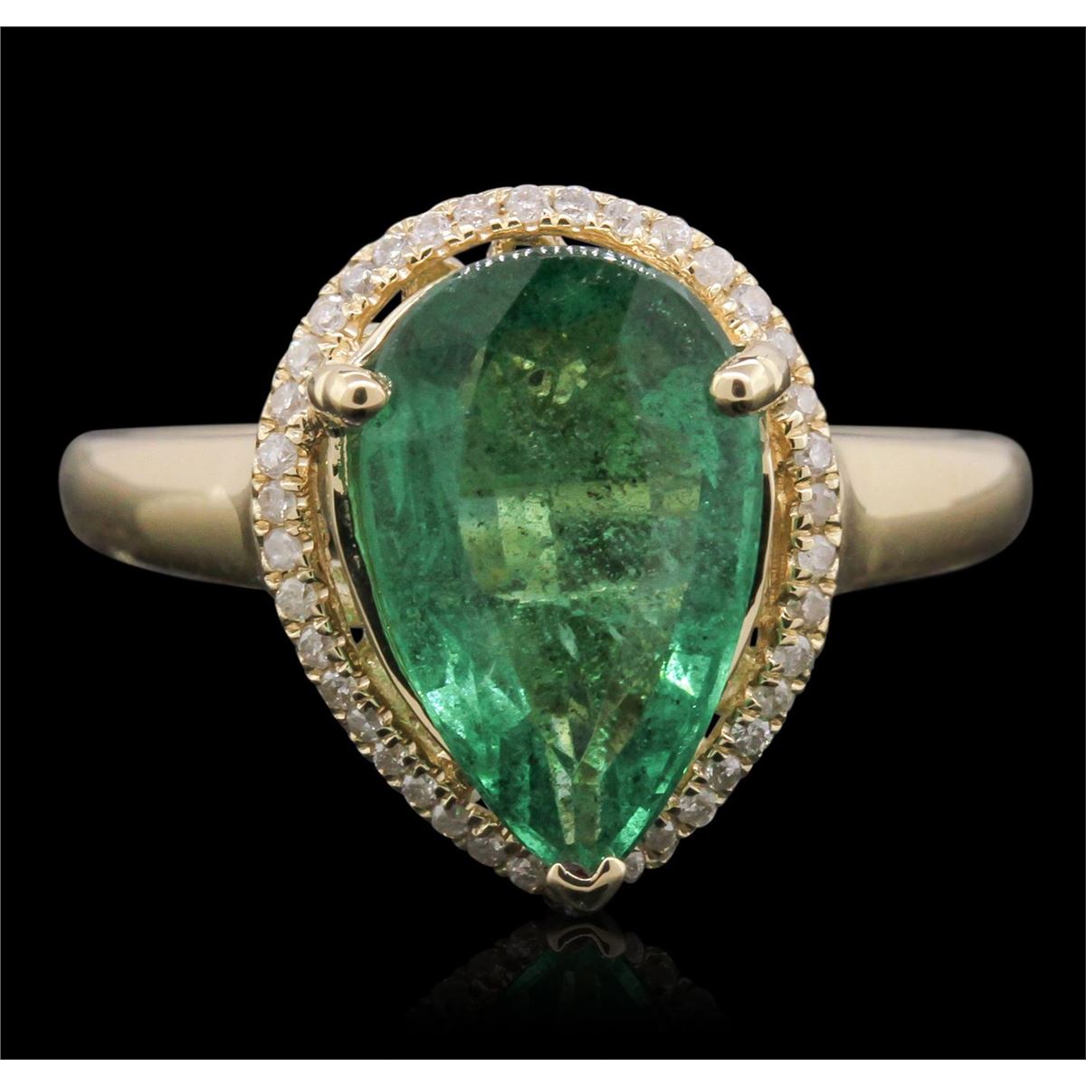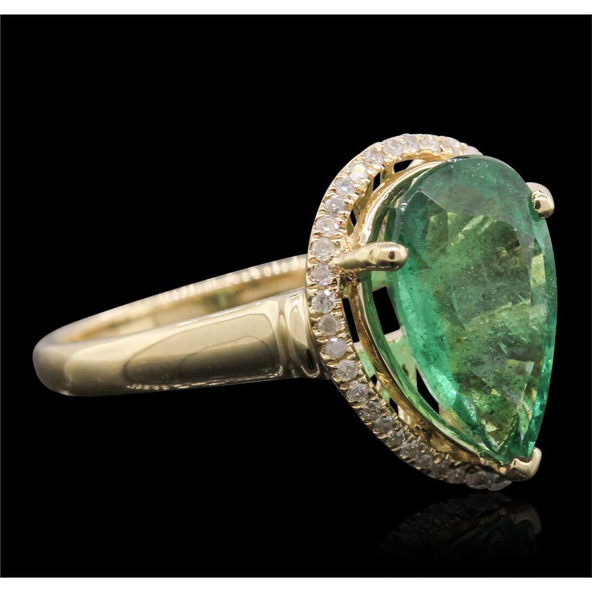 One electronically tested 14KT yellow gold ladies cast emerald and diamond ring with a bright polish finish. The emerald is set within a diamond bezel supported by tapering shoulders, completed by a one and one-half millimeter wide band. Trademark is Orianne. Identified with markings of "14K". Condition is new, good workmanship. Containing: One prong set pear mixed cut natural emerald, measuring 13.00 x 7.80 x 4.50mm, 8%. bulge factor, approximate weight of 2.68ct., clarity is heavily included, type III, medium dark, moderately strong, very slightly bluish green color, (GIA vslbG 6/4), cut is good. Transmitting light with a minimum of distortion, transparent. Naturally occurring internal & external characteristics are present. Indications of oil residue. Graded in the setting. Thirty-Nine prong set round brilliant cut diamonds, measuring 1.10 - 1.00 x 0.63mm (depth est.) approximate. Total Weight of 39 Stones = 0.26ct. Graded in the setting. Clarity: I-1 to I-2 . Color: G - I. Total Weight of Colored Stones 2.68ct. Total Weight of Diamonds 0.26ct. Total Weight of Ring 3.69gm. AIG Appraised at $6,925.00.