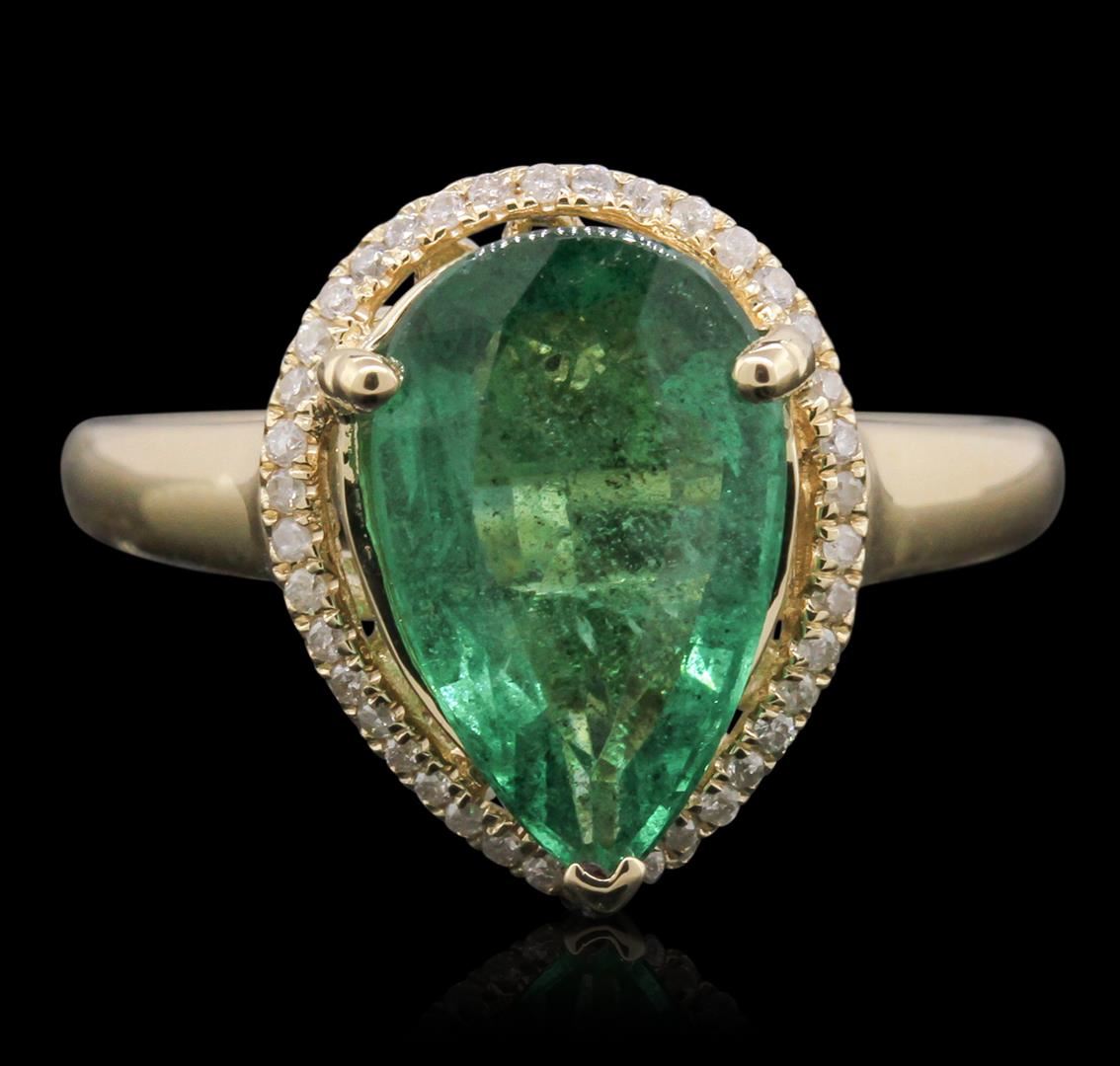 One electronically tested 14KT yellow gold ladies cast emerald and diamond ring with a bright polish finish. The emerald is set within a diamond bezel supported by tapering shoulders, completed by a one and one-half millimeter wide band. Trademark is Orianne. Identified with markings of "14K". Condition is new, good workmanship. Containing: One prong set pear mixed cut natural emerald, measuring 13.00 x 7.80 x 4.50mm, 8%. bulge factor, approximate weight of 2.68ct., clarity is heavily included, type III, medium dark, moderately strong, very slightly bluish green color, (GIA vslbG 6/4), cut is good. Transmitting light with a minimum of distortion, transparent. Naturally occurring internal & external characteristics are present. Indications of oil residue. Graded in the setting. Thirty-Nine prong set round brilliant cut diamonds, measuring 1.10 - 1.00 x 0.63mm (depth est.) approximate. Total Weight of 39 Stones = 0.26ct. Graded in the setting. Clarity: I-1 to I-2 . Color: G - I. Total Weight of Colored Stones 2.68ct. Total Weight of Diamonds 0.26ct. Total Weight of Ring 3.69gm. AIG Appraised at $6,925.00.