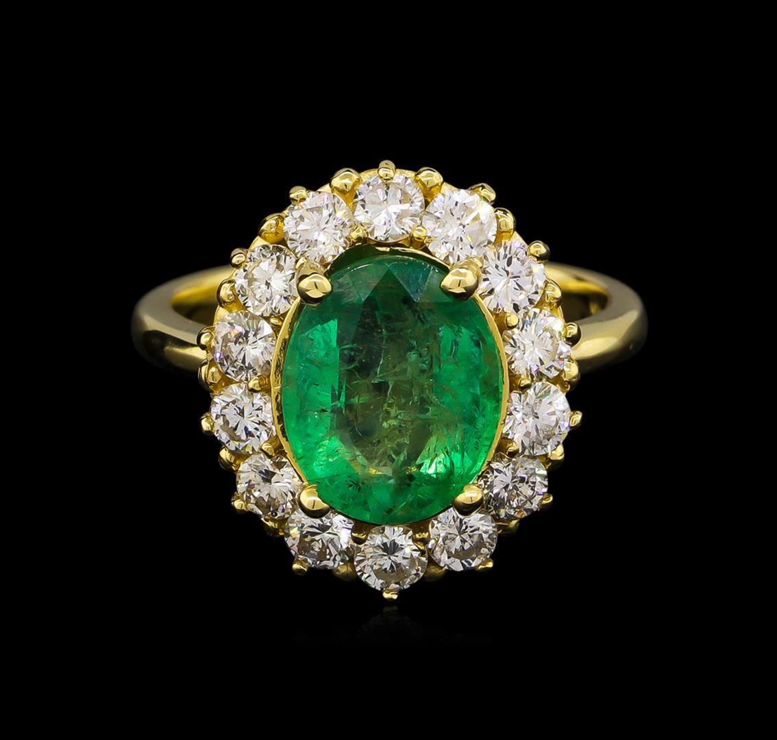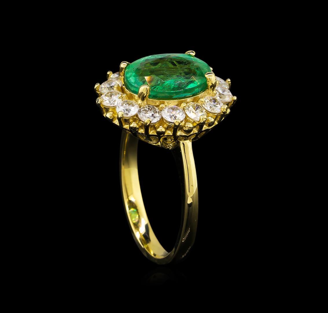 One electronically tested 14KT yellow gold ladies cast emerald and diamond ring with a bright polish finish. Condition is new, good workmanship. The featured emerald is set within a diamond bezel supported by tapering shoulders, completed by a two and one-half millimeter wide band. Identified with markings of "K14". Containing: One prong set oval mixed cut natural emerald, measuring 10.45 x 8.40 x 5.25mm, 6% bulge factor, approximate weight of 2.69ct, clarity is heavily included, type III, medium dark, very slightly grayish, very slightly bluish green color, (GIA vslbG 6/3), cut is good. Transmitting light with a minimum of distortion, transparent. Naturally occurring internal & external characteristics are present. Indications of oil residue. Graded in the setting. Fourteen prong set round brilliant cut diamonds, measuring 2.90 - 2.80 x 1.71mm (depth est.) approximate total weight of 14 Stones = 1.28ct. Graded in the setting. Clarity SI-1 to SI-2 Color G - I Total Weight of Colored Stones 2.69ct. Total Weight of Diamonds 1.28ct. Total Weight of Ring 5.52 grams. AIG Appraised at $6,535.00.