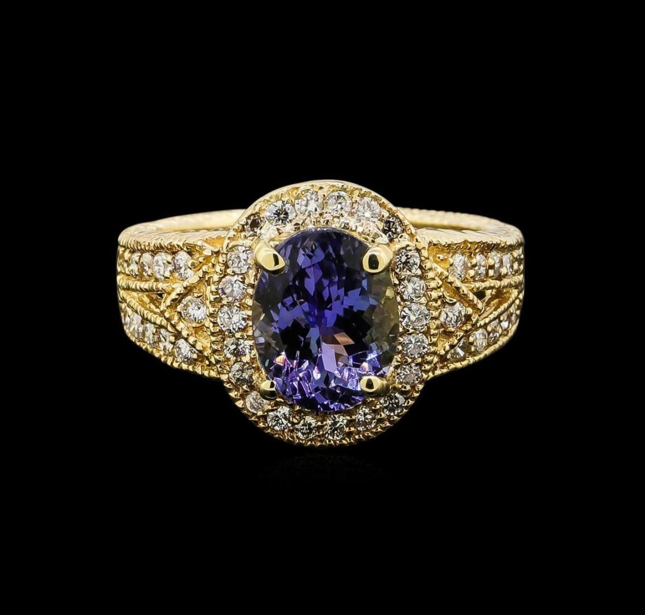 One electronically tested 14KT yellow gold ladies cast tanzanite and diamond ring with a bright polish finish. Condition is new. Containing: One prong set oval modified brilliant cut natural tanzanite, measuring 9.20 x 7.30 x 4.75mm, approximate weight of 2.70ct., clarity is eye clean, type I, medium, moderately strong, violet color, (GIA V 5/4), cut is good. Forty-Four prong set round brilliant cut diamonds, measuring 1.50 - 1.50 x 0.90mm (depth est.) approximate total weight of 44 Stones = 0.59ct. Clarity: SI-1 to SI-2. Color: I - J, Cut is Good. Colored gemstones are presumed to have been subjected to commonly used enhancement processes. All diamonds and colored gemstones are graded in the mounting, unless otherwise stated. Total Weight of Colored Stones 2.70ct. Total Weight of Diamonds 0.59ct. Total Weight of Ring 7.00 grams. GGL Appraised.