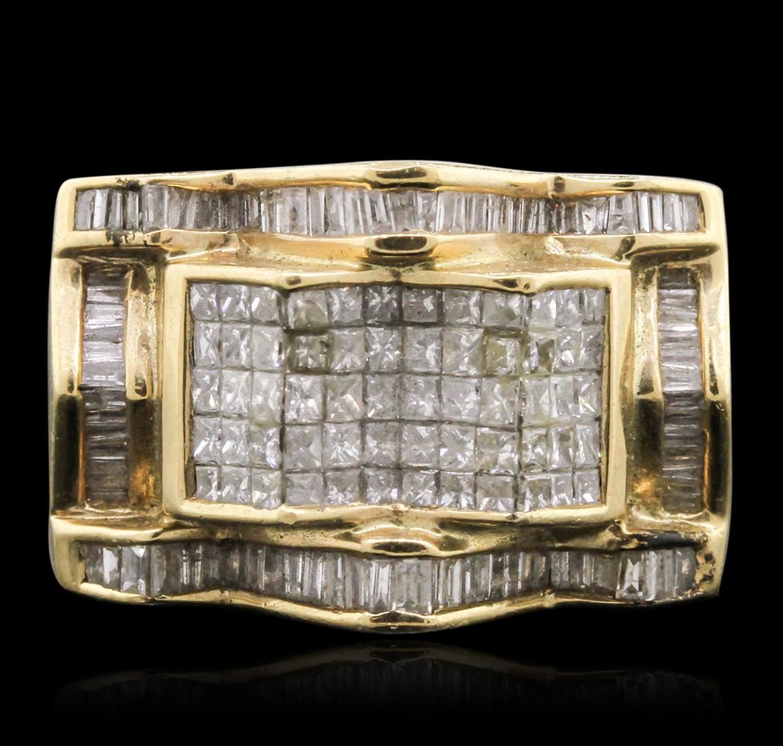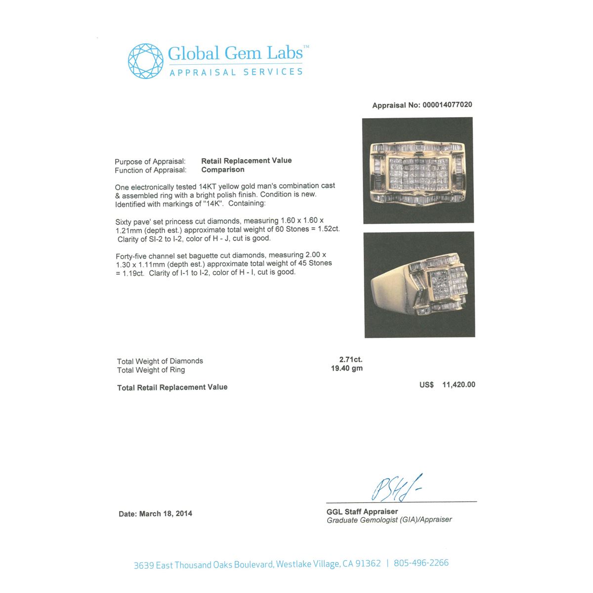 One electronically tested 14KT yellow gold man's combination cast & assembled ring with a bright polish finish. Condition is new. Identified with markings of "14K". Containing: Sixty pave' set princess cut diamonds, measuring 1.60 x 1.60 x 1.21mm (depth est.) approximate. Total Weight of 60 Stones = 1.52ct. Clarity: SI-2 to I-2. Color: H - J, Cut is Good. Forty-Five channel set baguette cut diamonds, measuring 2.00 x 1.30 x 1.11mm (depth est.) approximate. Total Weight of 45 Stones = 1.19ct. Clarity: I-1 to I-2. Color: H - I, Cut is Good. Total Weight of Diamonds 2.71ct. Total Weight of Ring 19.40gm. GGL Appraised at $11,420.00.