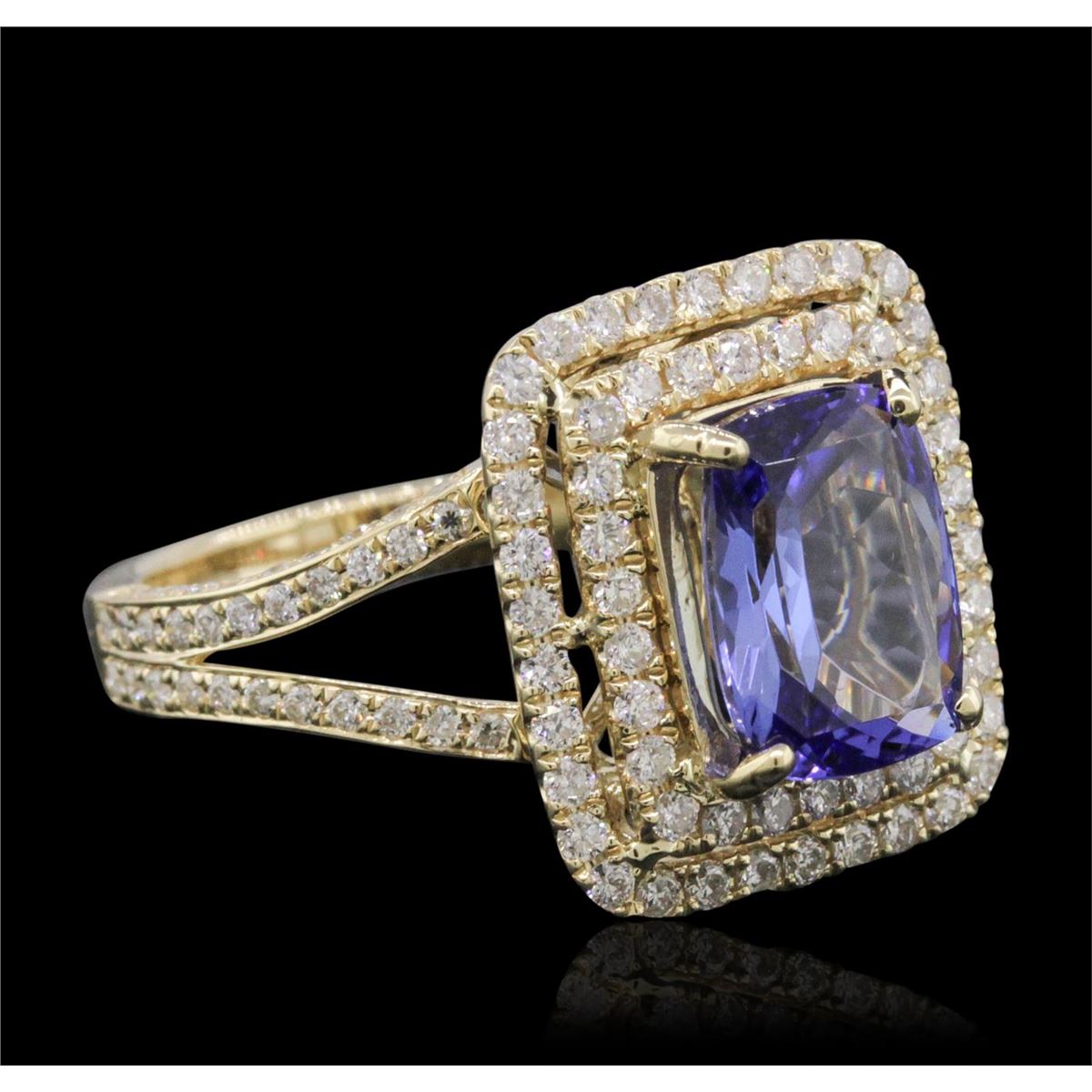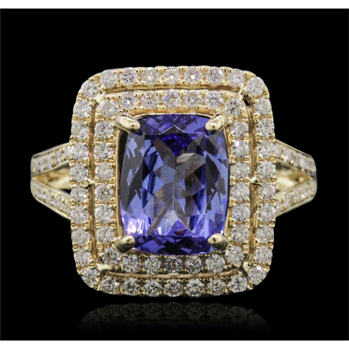 One electronically tested 14KT yellow gold ladies combination cast & assembled tanzanite and diamond ring with a split shank with a bright polish finish. Identified with markings of "14K". Condition is new. Containing: One prong set rectangular cushion modified brilliant cut natural tanzanite, measuring 10.02 x 7.67 x 4.50mm, approximate weight of 2.72ct., clarity is eye clean, type I, medium, moderately strong, violet color, (GIA V 5/4), cut is very good. One Hundred Forty-Four prong set round brilliant cut diamonds, measuring 1.20 - 1.20 x 0.72mm (depth est.) approximate total weight of 144 Stones = 0.91ct. Clarity: I-1 to I-2. Color: J - K, Cut is Good. Colored gemstones are presumed to have been subjected to commonly used enhancement processes. All diamonds and colored gemstones are graded in the mounting, unless otherwise stated. Total Weight of Colored Stones 2.72ct. Total Weight of Diamonds 0.91ct. Total Weight of Ring 6.70 grams. GGL Appraised at $7,770.00.