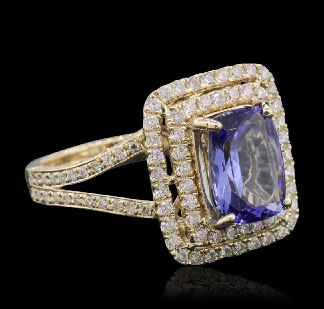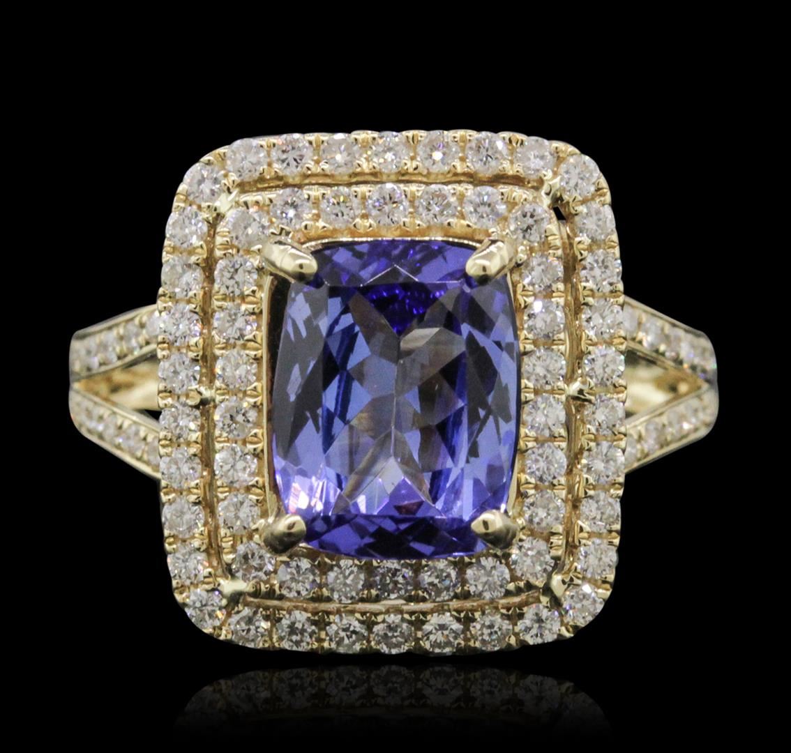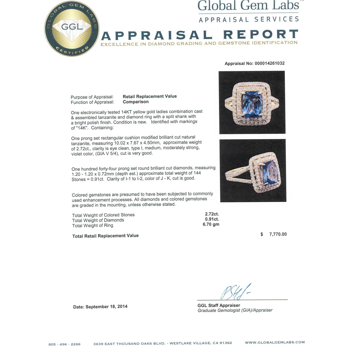 One electronically tested 14KT yellow gold ladies combination cast & assembled tanzanite and diamond ring with a split shank with a bright polish finish. Identified with markings of "14K". Condition is new. Containing: One prong set rectangular cushion modified brilliant cut natural tanzanite, measuring 10.02 x 7.67 x 4.50mm, approximate weight of 2.72ct., clarity is eye clean, type I, medium, moderately strong, violet color, (GIA V 5/4), cut is very good. One Hundred Forty-Four prong set round brilliant cut diamonds, measuring 1.20 - 1.20 x 0.72mm (depth est.) approximate total weight of 144 Stones = 0.91ct. Clarity: I-1 to I-2. Color: J - K, Cut is Good. Colored gemstones are presumed to have been subjected to commonly used enhancement processes. All diamonds and colored gemstones are graded in the mounting, unless otherwise stated. Total Weight of Colored Stones 2.72ct. Total Weight of Diamonds 0.91ct. Total Weight of Ring 6.70 grams. GGL Appraised at $7,770.00.