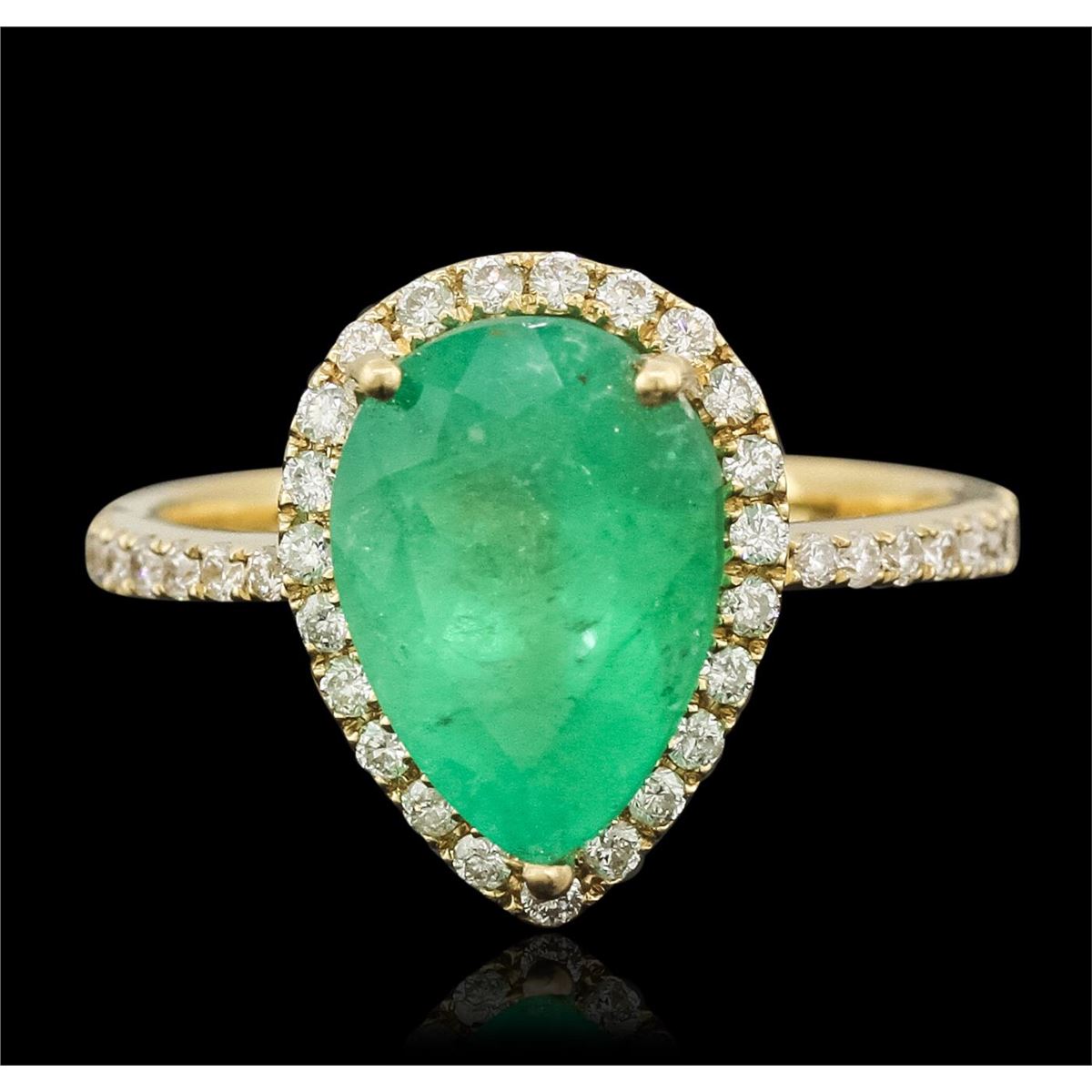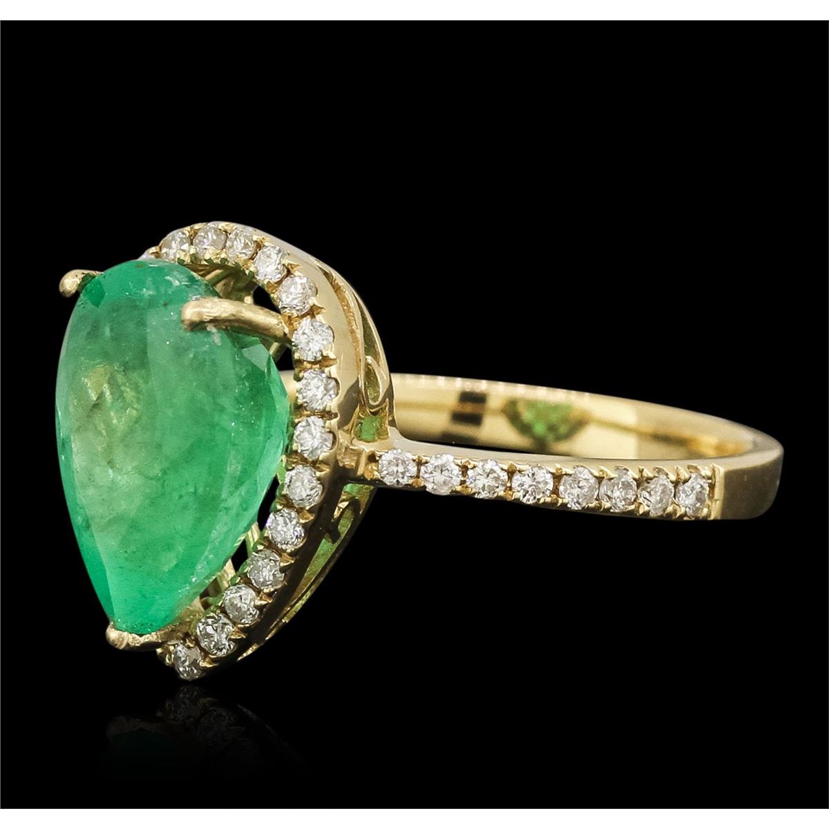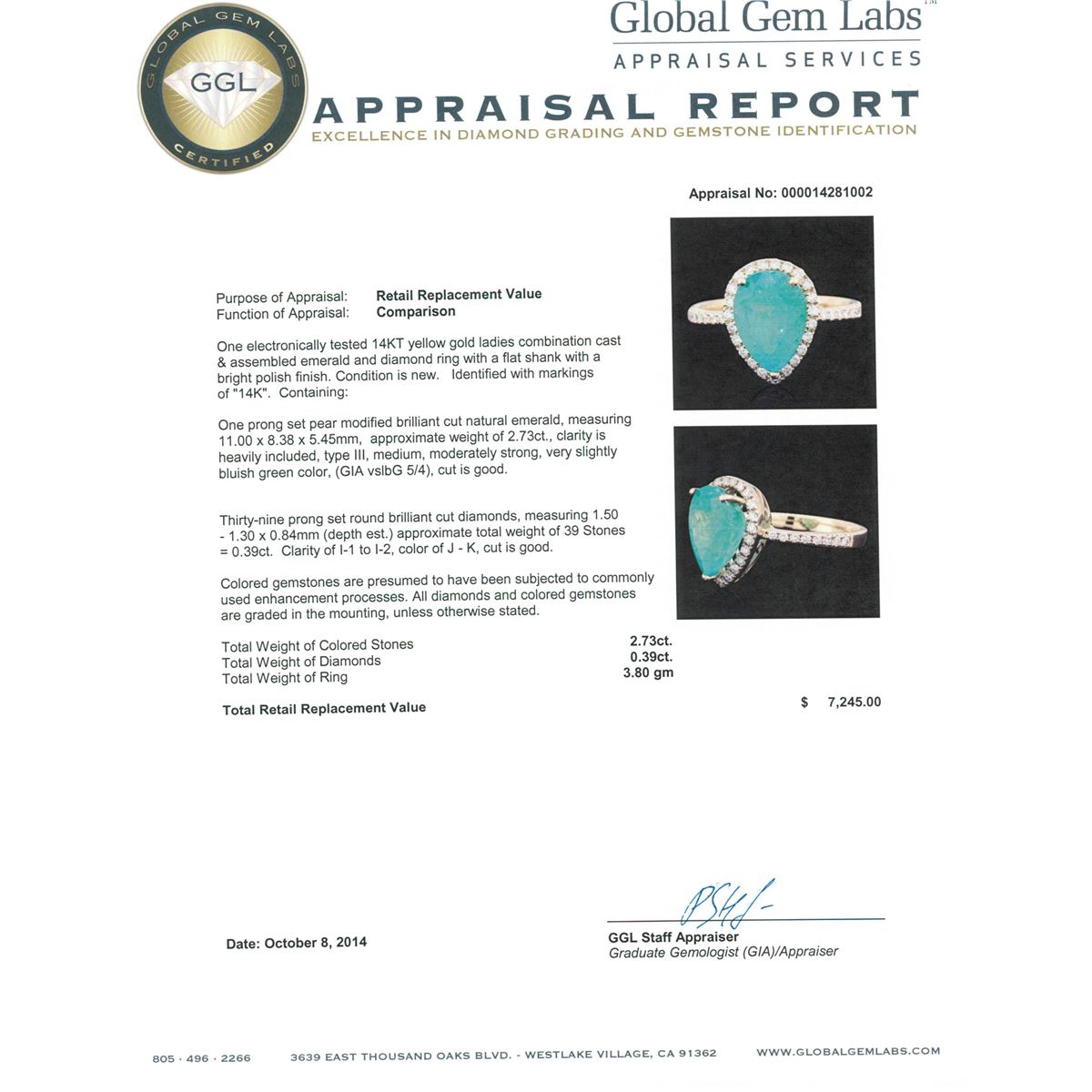 One electronically tested 14KT yellow gold ladies combination cast & assembled emerald and diamond ring with a flat shank with a bright polish finish. Identified with markings of "14K". Condition is new. Containing: One prong set pear modified brilliant cut natural emerald, measuring 11.00 x 8.38 x 5.45mm, approximate weight of 2.73ct., clarity is heavily included, type III, medium, moderately strong, very slightly bluish green color, (GIA vslbG 5/4), cut is good. Thirty-Nine prong set round brilliant cut diamonds, measuring 1.50 - 1.30 x 0.84mm (depth est.) approximate total weight of 39 Stones = 0.39ct. Clarity: I-1 to I-2. Color: J - K, Cut is Good. Colored gemstones are presumed to have been subjected to commonly used enhancement processes. All diamonds and colored gemstones are graded in the mounting, unless otherwise stated. Total Weight of Colored Stones 2.73ct. Total Weight of Diamonds 0.39ct. Total Weight of Ring 3.80 grams. GGL Appraised at $7,245.00.