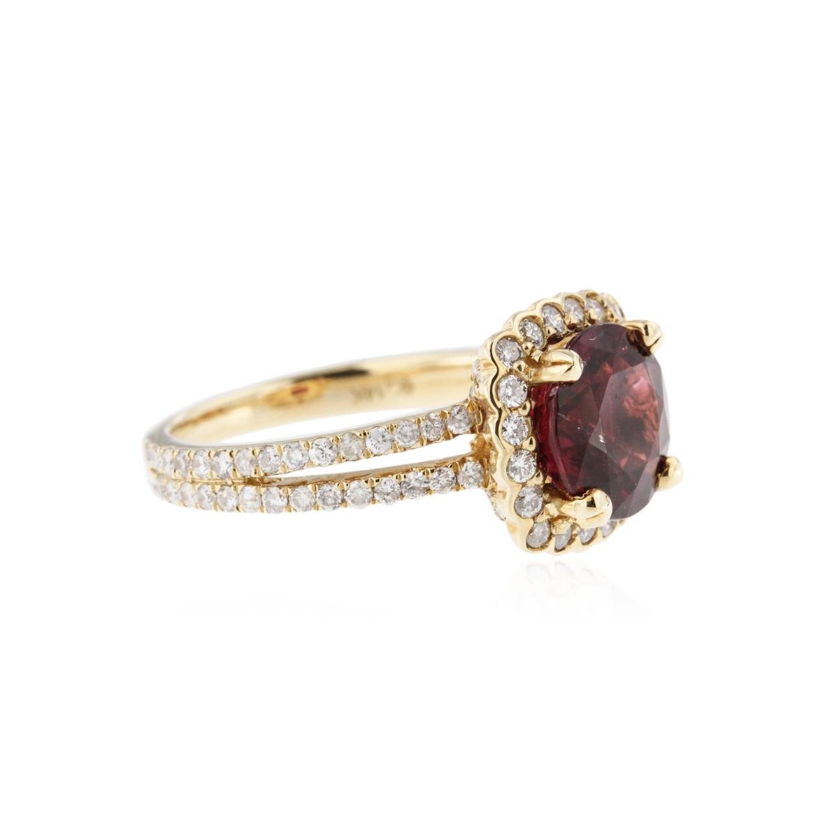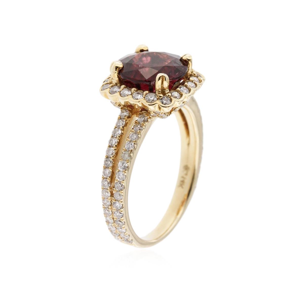 One electronically tested 14KT yellow gold ladies cast tourmaline and diamond ring with a bright polish finish. Condition is new, good workmanship. The featured tourmaline is set within a diamond bezel supported by a diamond set under gallery and diamond set split shoulders, completed by a two millimeter wide band. Trademark is Orianne. Identified with markings of "14K". Containing: One prong set round mixed cut natural rubellite, measuring 9.00 - 8.80 x 5.20 mm, 6%. bulge factor, approximate weight of 2.73ct., clarity is slightly included, type III, medium dark, very slightly brownish, strongly purplish red color, (GIA stpR 6/3), cut is good. Transmitting light with a minimum of distortion, transparent. Naturally occurring internal & external characteristics are present. Graded in the setting. Twenty half bezel set round brilliant cut diamonds, measuring 1.50 - 1.40 x 0.87mm (depth est.) approximate. Total Weight of 20 Stones = 0.32ct. Graded in the setting. Clarity: SI-1 to I-1. Color: G - I Sixty prong set round brilliant cut diamonds, measuring 1.30 - 1.20 x 0.75mm (depth est.) approximate. Total Weight of 60 Stones = 0.52ct. Graded in the setting. Clarity: I-1 to I-2. Color: G - I. Total Weight of Colored Stones 2.73ct. Total Weight of Diamonds 0.84ct. Total Weight of Ring 4.89 grams. AIG Appraised at $5,210.00.