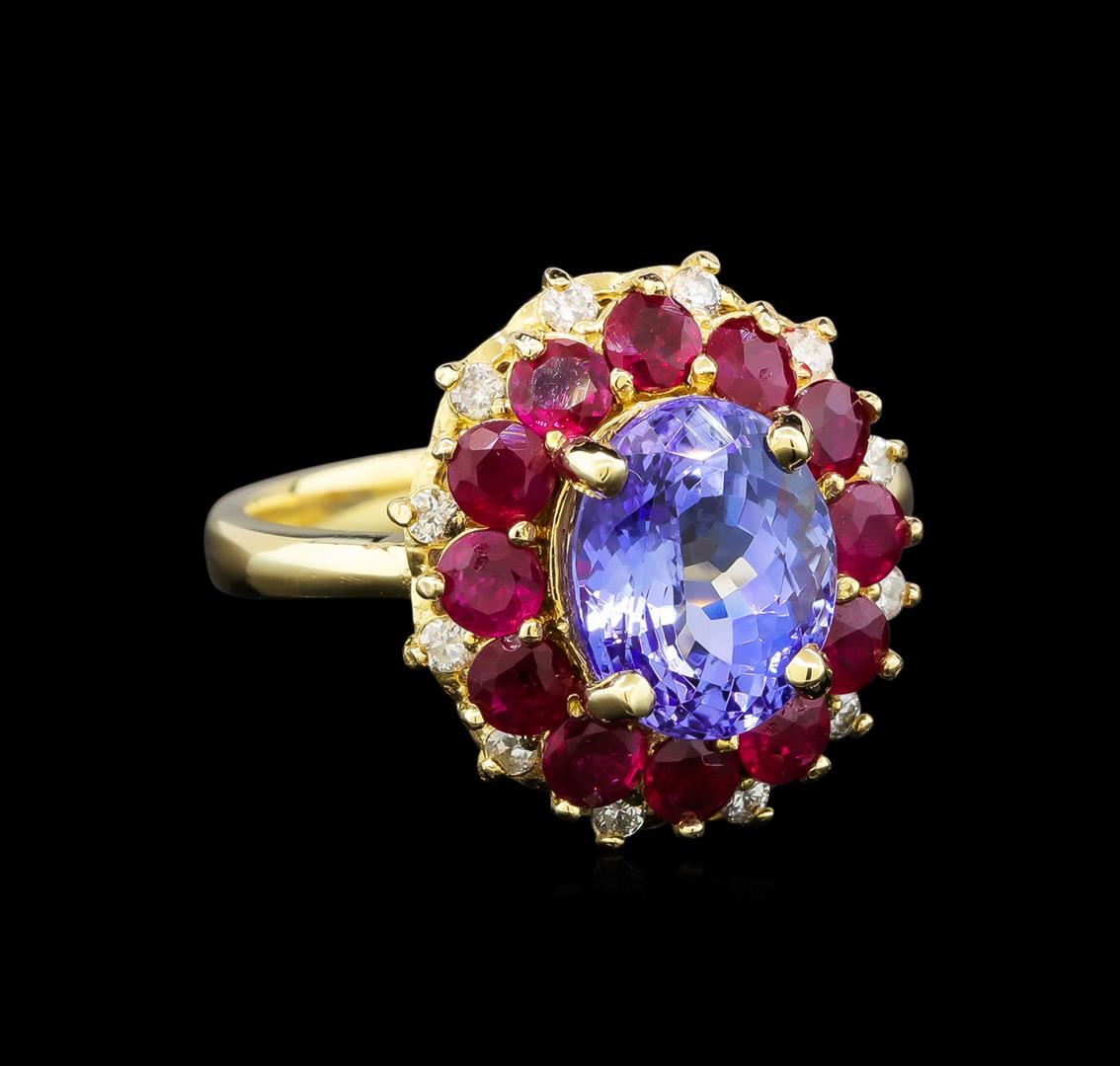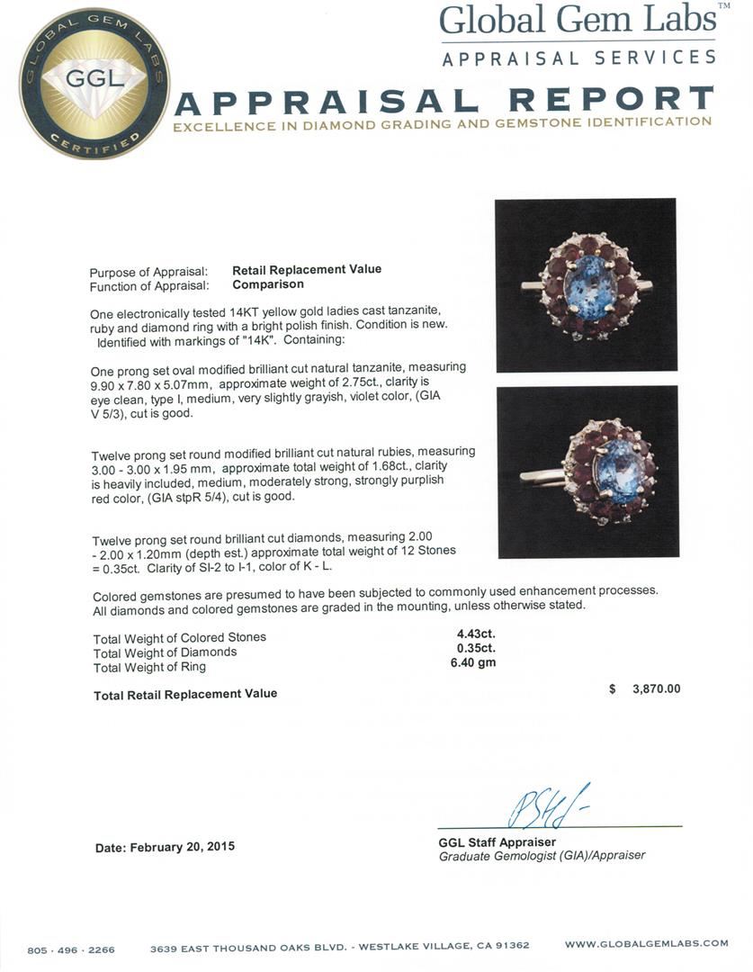 One electronically tested 14KT yellow gold ladies cast tanzanite, ruby and diamond ring with a bright polish finish. Identified with markings of "14K". Condition is new. Containing: One prong set oval modified brilliant cut natural tanzanite, measuring 9.90 x 7.80 x 5.07mm, approximate weight of 2.75ct., clarity is eye clean, type I, medium, very slightly grayish, violet color, (GIA V 5/3), cut is good. Twelve prong set round modified brilliant cut natural rubies, measuring 3.00 - 3.00 x 1.95 mm, approximate total weight of 1.68ct., clarity is heavily included, medium, moderately strong, strongly purplish red color, (GIA stpR 5/4), cut is good. Twelve prong set round brilliant cut diamonds, measuring 2.00 - 2.00 x 1.20mm (depth est.) approximate total weight of 12 Stones = 0.35ct. Clarity: SI-2 to I-1. Color: K - L. Colored gemstones are presumed to have been subjected to commonly used enhancement processes. All diamonds and colored gemstones are graded in the mounting, unless otherwise stated. Total Weight of Colored Stones 4.43ct. Total Weight of Diamonds 0.35ct. Total Weight of Ring 6.40 grams. GGL Appraised at $3,870.00.