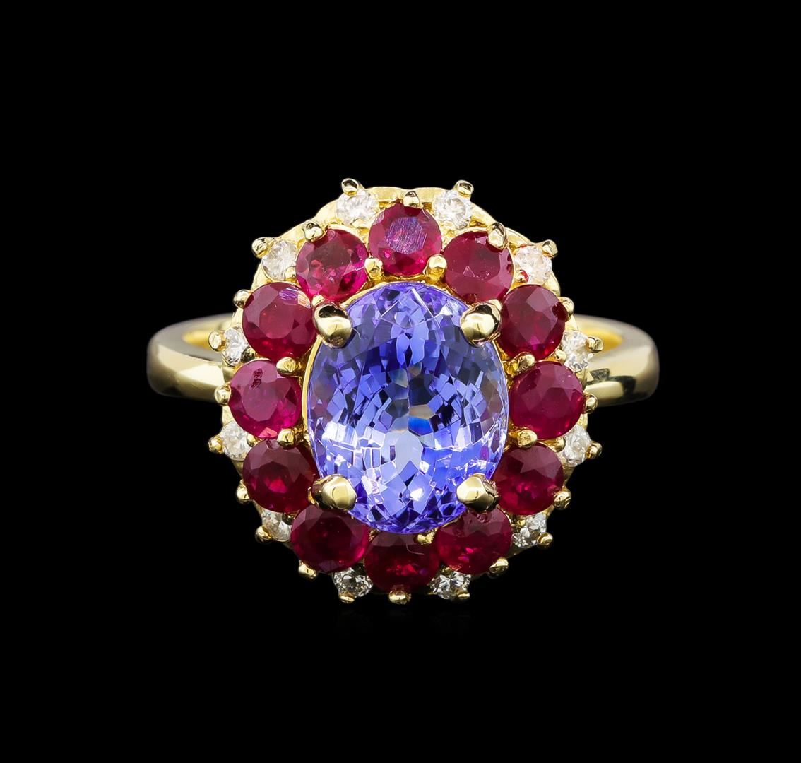 One electronically tested 14KT yellow gold ladies cast tanzanite, ruby and diamond ring with a bright polish finish. Identified with markings of "14K". Condition is new. Containing: One prong set oval modified brilliant cut natural tanzanite, measuring 9.90 x 7.80 x 5.07mm, approximate weight of 2.75ct., clarity is eye clean, type I, medium, very slightly grayish, violet color, (GIA V 5/3), cut is good. Twelve prong set round modified brilliant cut natural rubies, measuring 3.00 - 3.00 x 1.95 mm, approximate total weight of 1.68ct., clarity is heavily included, medium, moderately strong, strongly purplish red color, (GIA stpR 5/4), cut is good. Twelve prong set round brilliant cut diamonds, measuring 2.00 - 2.00 x 1.20mm (depth est.) approximate total weight of 12 Stones = 0.35ct. Clarity: SI-2 to I-1. Color: K - L. Colored gemstones are presumed to have been subjected to commonly used enhancement processes. All diamonds and colored gemstones are graded in the mounting, unless otherwise stated. Total Weight of Colored Stones 4.43ct. Total Weight of Diamonds 0.35ct. Total Weight of Ring 6.40 grams. GGL Appraised at $3,870.00.