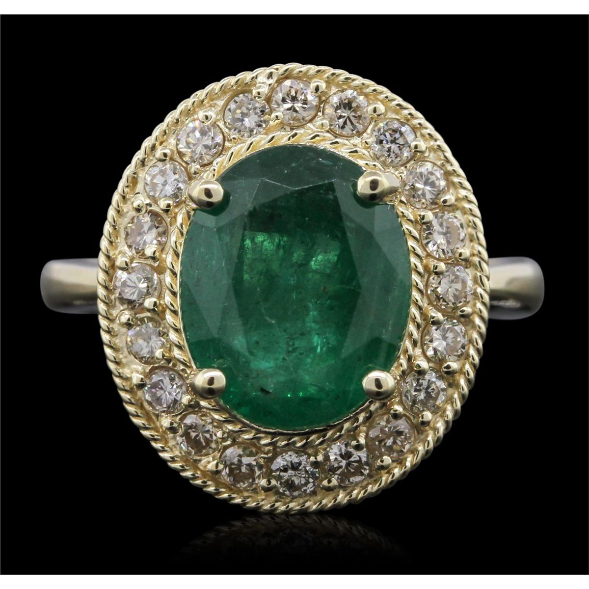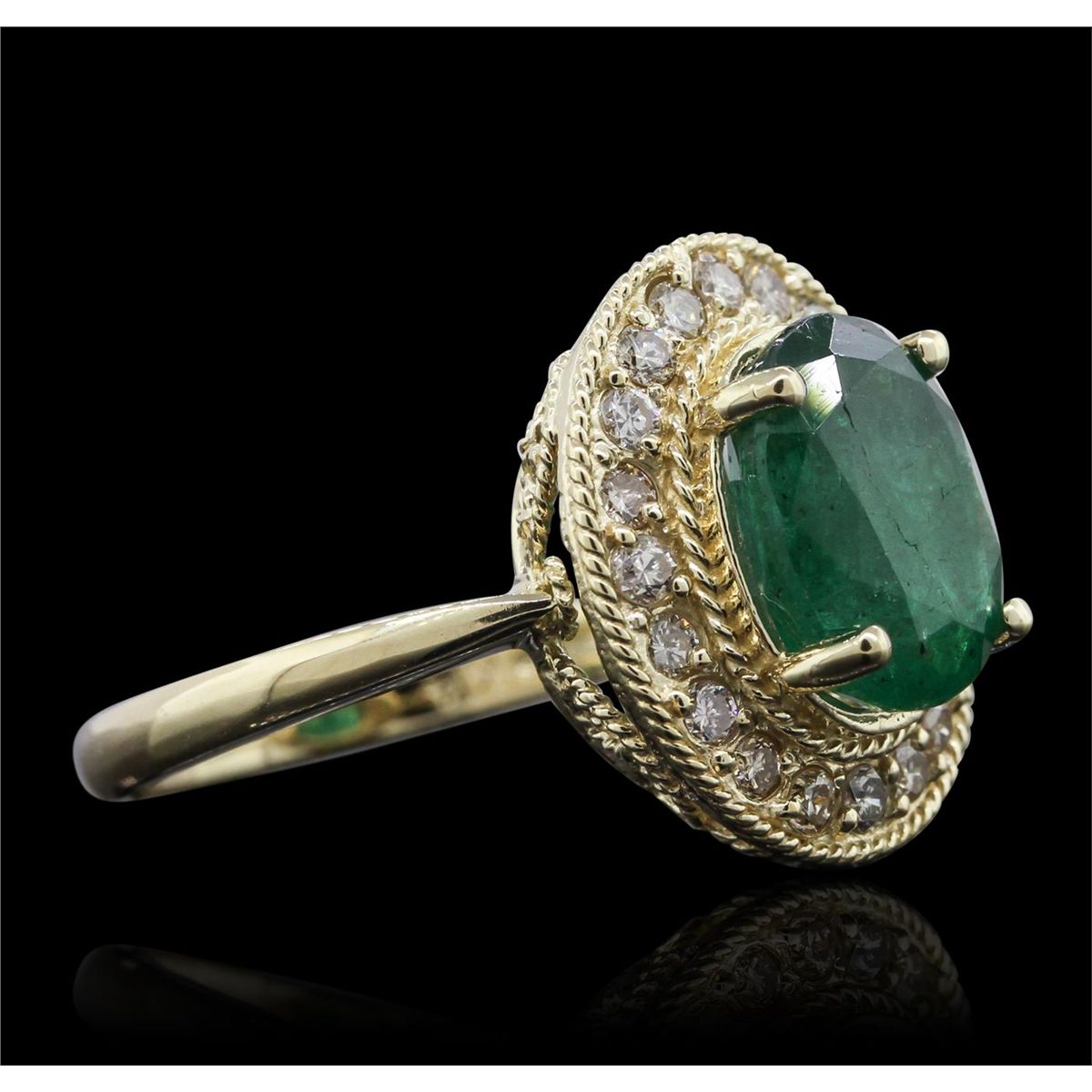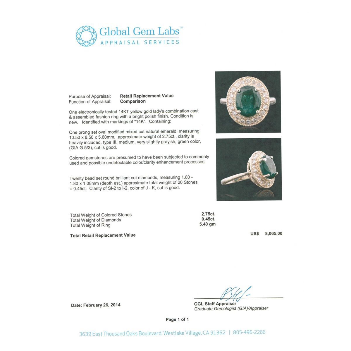Great Condition! One electronically tested 14KT yellow gold Ladies combination cast & assembled fashion ring with a bright polish finish. Condition is new. Identified with markings of "14K". Containing: One prong set oval modified mixed cut natural emerald, measuring 10.50 x 8.50 x 5.60mm, approximate weight of 2.75ct., clarity is heavily included, type III, medium, very slightly grayish, green color, (GIA G 5/3), cut is good. Colored gemstones are presumed to have been subjected to commonly used and possible undetectable color/clarity enhancement processes. Twenty bead set round brilliant cut diamonds, measuring 1.80 - 1.80 x 1.08mm (depth est.) approximate total weight of 20 Stones = 0.45ct. Clarity of SI-2 to I-2, Color of J - K, Cut is Good. Total Weight of Colored Stones 2.75ct. Total Weight of Diamonds 0.45ct. Total Weight of Ring 5.40 grams. GGL Appraised at $8,065.00.