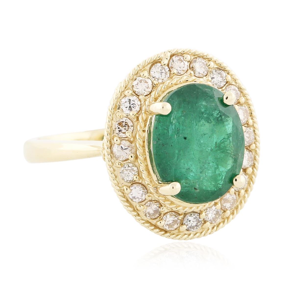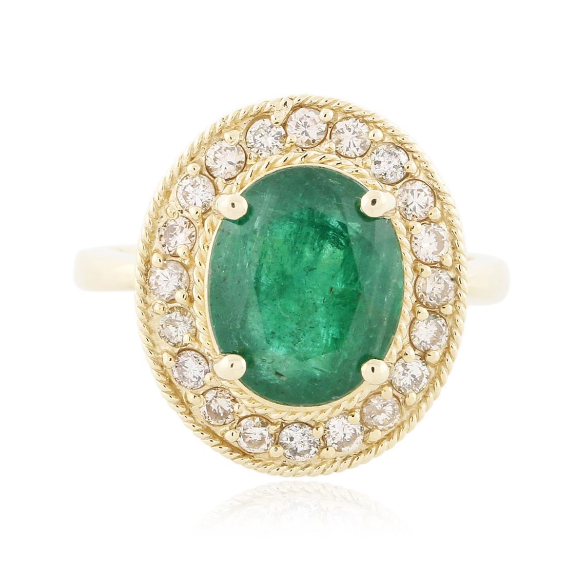 Great Condition! One electronically tested 14KT yellow gold Ladies combination cast & assembled fashion ring with a bright polish finish. Condition is new. Identified with markings of "14K". Containing: One prong set oval modified mixed cut natural emerald, measuring 10.50 x 8.50 x 5.60mm, approximate weight of 2.75ct., clarity is heavily included, type III, medium, very slightly grayish, green color, (GIA G 5/3), cut is good. Colored gemstones are presumed to have been subjected to commonly used and possible undetectable color/clarity enhancement processes. Twenty bead set round brilliant cut diamonds, measuring 1.80 - 1.80 x 1.08mm (depth est.) approximate total weight of 20 Stones = 0.45ct. Clarity of SI-2 to I-2, Color of J - K, Cut is Good. Total Weight of Colored Stones 2.75ct. Total Weight of Diamonds 0.45ct. Total Weight of Ring 5.40 grams. GGL Appraised at $8,065.00.