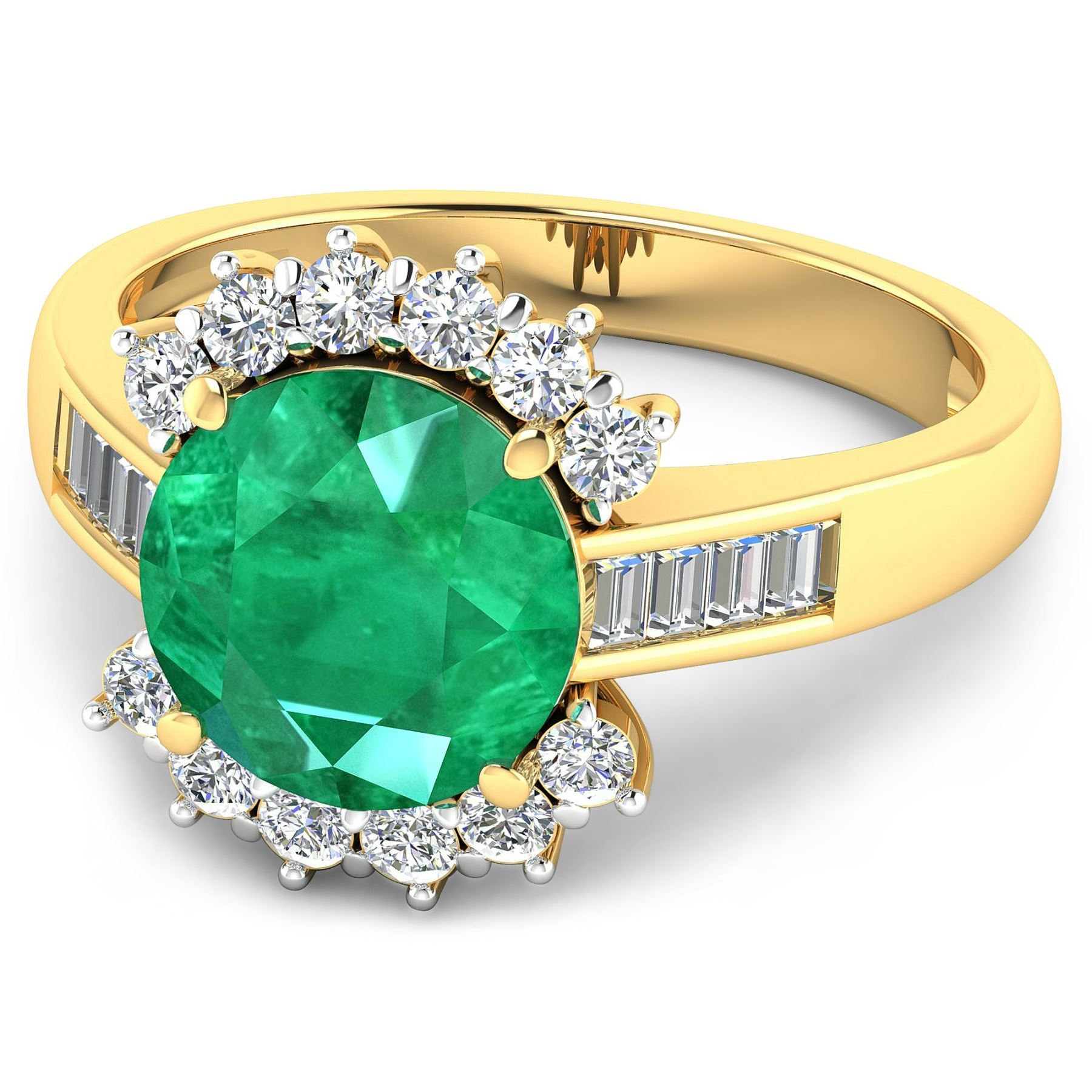 Zambian Emerald (AA) Round 9.00mm - 1Pc + White Diamond Baguette 2.00x1.50mm - 8Pcs + White Diamond F/C Round 2.00mm - 12Pcs ( White Pan Rhodium ) ( Diamond Quality : SI-2/HI ). Total weight of gemstone is 2.75cts. Total weight of Diamonds is 0.58cts. Total weight of this ring is 3.97 grams. Ring size 7.